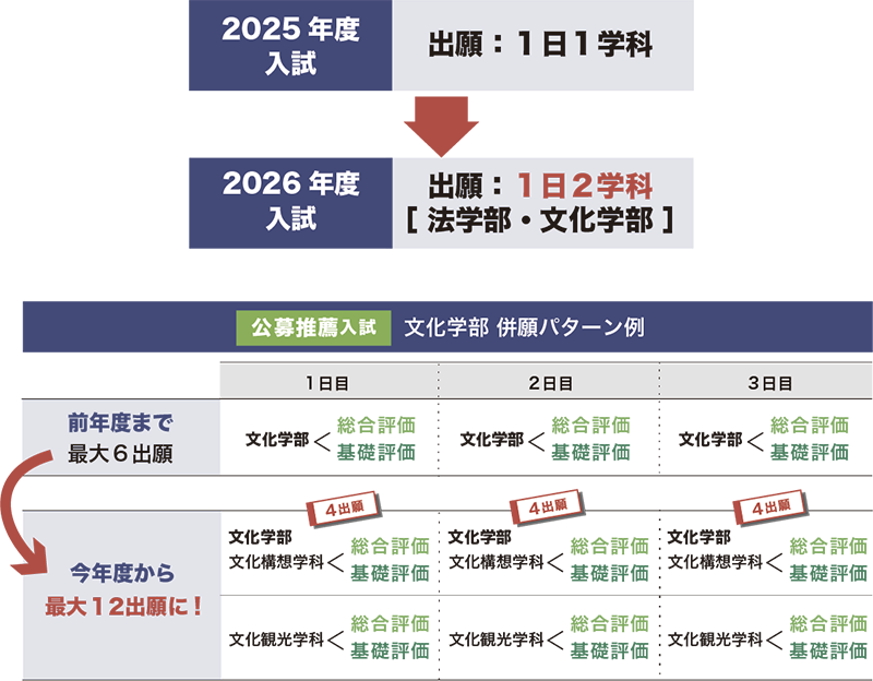 法学部・文化学部では、1日2つの学科に出願することが可能になります。