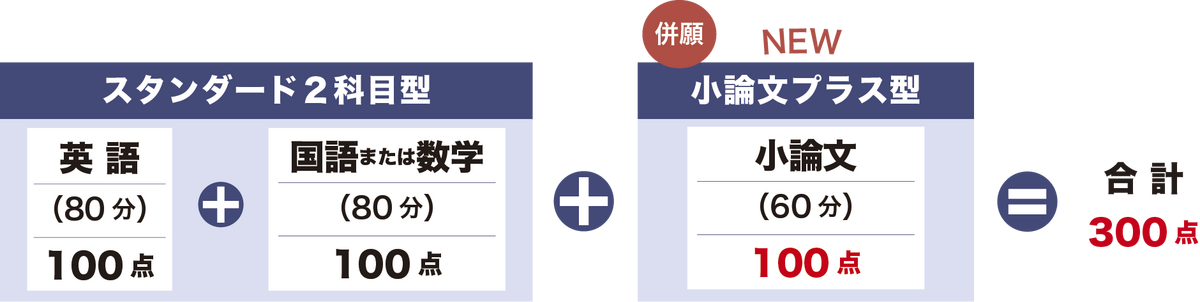 - スタンダード2科目型(英語・国語または数学)による合否判定に加えて「小論文」の試験を行い、3科目で合否判定します。