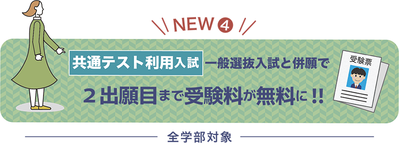 NEW❹ 全学部 一般選抜入試と併願で2出願目まで受験料が無料に!