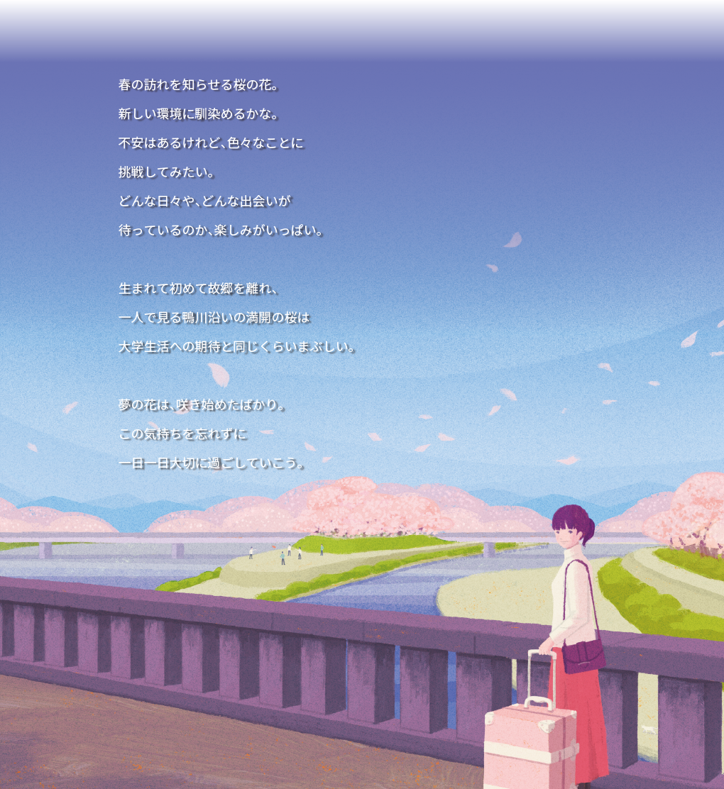 甲子園球場が16個も収まる広大なワンキャンパスは、「むすんで、うみだす。」拠点として、個性豊かな学生たちが学部や専門の枠を越えて出会い、互いを刺激し成長する場となっています。