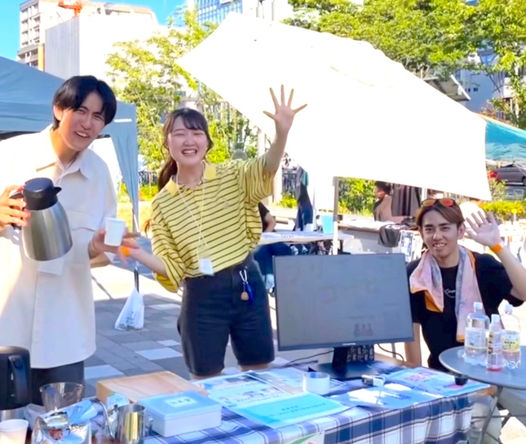 川村 メインの活動は、学内で行なう「フリーコーヒー」という活動です!授業期間中の毎週水・金曜日の昼休み(12:00~14:00)に、16号館前のベンチで無料のコーヒーを提供することで、誰でもコーヒーをもらいに訪れることができ、訪れた人同士が交流できる場を作っています。