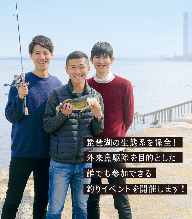 経営学部創設50周年の一環としたクラウドファンディング企画にて、私たち福冨ゼミの3年次生メンバーは、外来魚駆除を目的とする釣りイベントを開催します。琵琶湖は400万年もの歴史を持っており、世界で3番目に古い湖といわれています。長い歴史の間に独自の生態系を持ち、ビワコオオナマズなどの琵琶湖にしかいない生物も多く確認されています。しかし、その貴重な生態系を脅かしているのが、ブラックバスやブルーギルといった外来魚。私たちは琵琶湖の危機的状況を多くの人に知ってもらいたいと考え、誰でも気軽に参加できる釣りイベントを企画。SNSを活用した広報活動を行ったり、滋賀県庁に協力を依頼して釣り竿を貸していただいたり、寄付のお礼の品を考えて業者に発注したり、私たちだけでイベントをイチから作り上げてきました。無料で事前申込も不要のイベントですので、皆さんもぜひご参加ください!