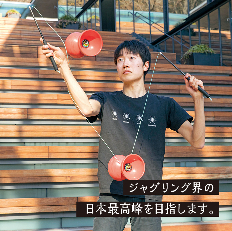 ディアボロは、2本のスティックで繋いだ糸の上でコマを高速で回転させ、さまざまな技で観客を魅了するジャグリングの一種。私は小学校6年生からディアボロを練習し始め、高校で全国1位に。それ以来、国内外の大会に参加し続けています。昨年は台湾で開催されたアジアインターナショナルディアボロカップで2位になることもできました。ディアボロに限れば世界トップクラスで競うことができていますが、ボールやシガーボックスといったその他の種目とパフォーマンスを競う場合、国内のジャパンジャグリングフェスティバルでも、まだ予選通過できたことがないのが現状です。もっと技のバリエーションを増やし、演技の構成に工夫を凝らし、観客に驚きのパフォーマンスを提供できるように…。より高いレベルを目指して、これからも練習し続けたいと思います。