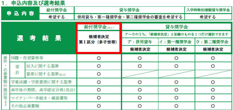 授業料減免を受けられる対象は、「大学等奨学生採用候補者決定通知【進学先提出用】」(下図)において、「1.申込内容及び選考結果」の下の赤枠部分が「候補者決定」と表記されていることが条件となります。