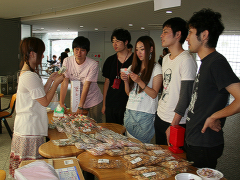 7月18日(月)、本学5号館ロビーにおいて経営学部在間敬子ゼミ3年次生2人・2年次生2人が、東日本大震災の被災地への復興支援を目的に復興応援カフェを開催した。