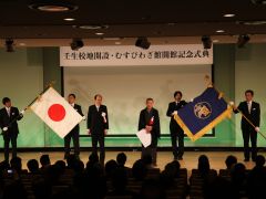 また、西陣織工業組合からは、西陣織で制作された国旗と学旗が寄贈された。