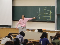 7月8日、共通教育科目「京都の伝統文化」のゲストスピーカーとして、大蔵流狂言師で本学卒業生である茂山七五三さん(1970年・経済卒)が本学を来訪した。