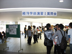 平成21年6月24日(水)午後、5号館1階ロビーにて、2年次生を対象に「演習I」合同ゼミ質問会が開催されました。これは、各担当教員の演習がどのような内容で行われているのか、ゼミではどんなイベントがあるかなど、演習Tを応募する際の参考にしてもらうため、毎年開催しています。