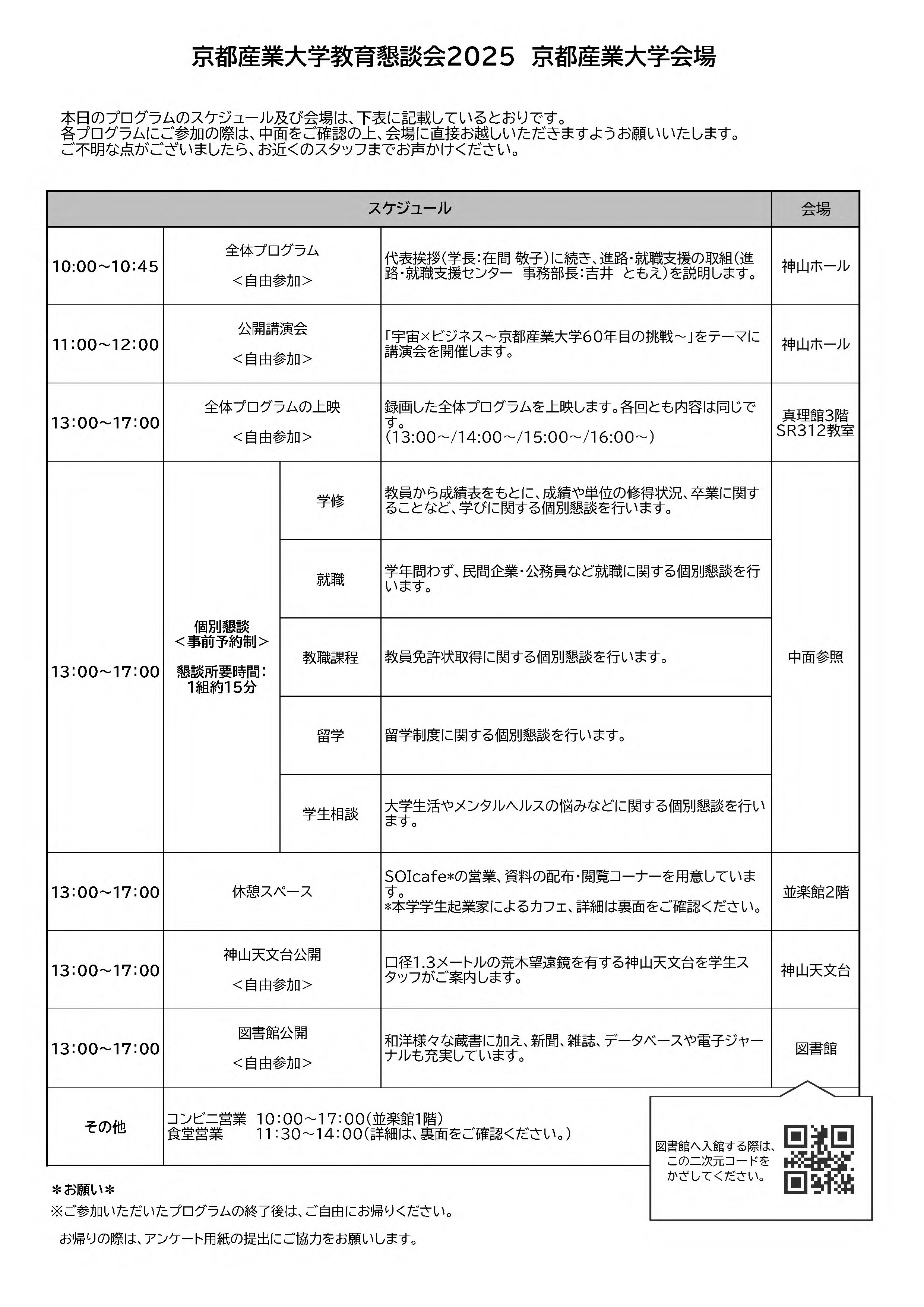 京都産業大学会場では、5つ全ての内容(「学修」「就職」「教職課程」「留学」「学生相談」)について、個別懇談をいたします。