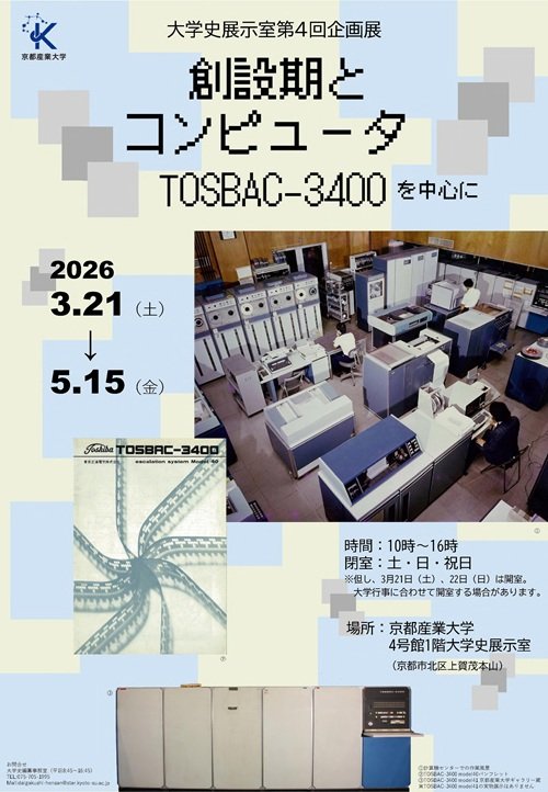 大学史展示室 第4回企画展「創設期とコンピュータ TOSBAC-3400を中心に」を令和8年3月21日(土)より、大学史展示室(4号館1階)にて開催します。