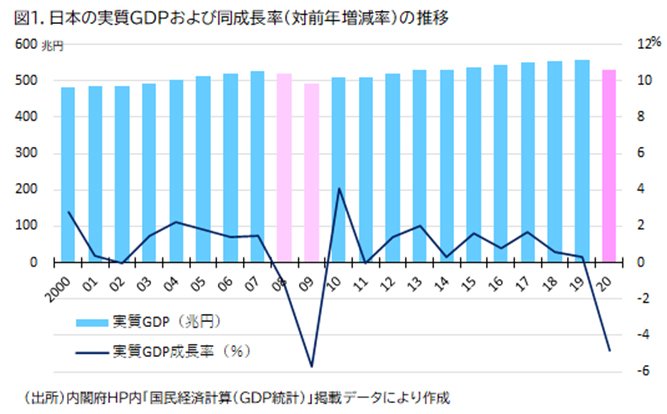 2020年には、日本国内での様々な商品の生産・販売・消費という基本的・実体的な経済活動の規模を表す実質GDP(国内総生産)は約530兆円であり、前年よりも約26兆円減少したため、経済成長率はマイナス4.8%となった。実質GDPがマイナス成長を記録したのは2008年米国発の世界金融危機(いわゆる「リーマン・ショック」)の影響を受けた2009年以来11年ぶりのことであり、マイナス幅もその時に匹敵する深刻な状況である(図1)。
