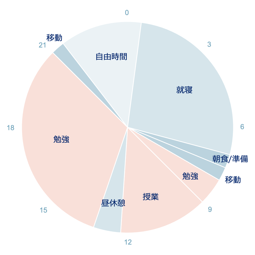 平日は基本的に学校に行っています。授業が週2日なので、授業がない日はゆっくり起きています。土日は基本的にバイトに行くため、授業の準備や試験勉強は平日にやる必要があります。