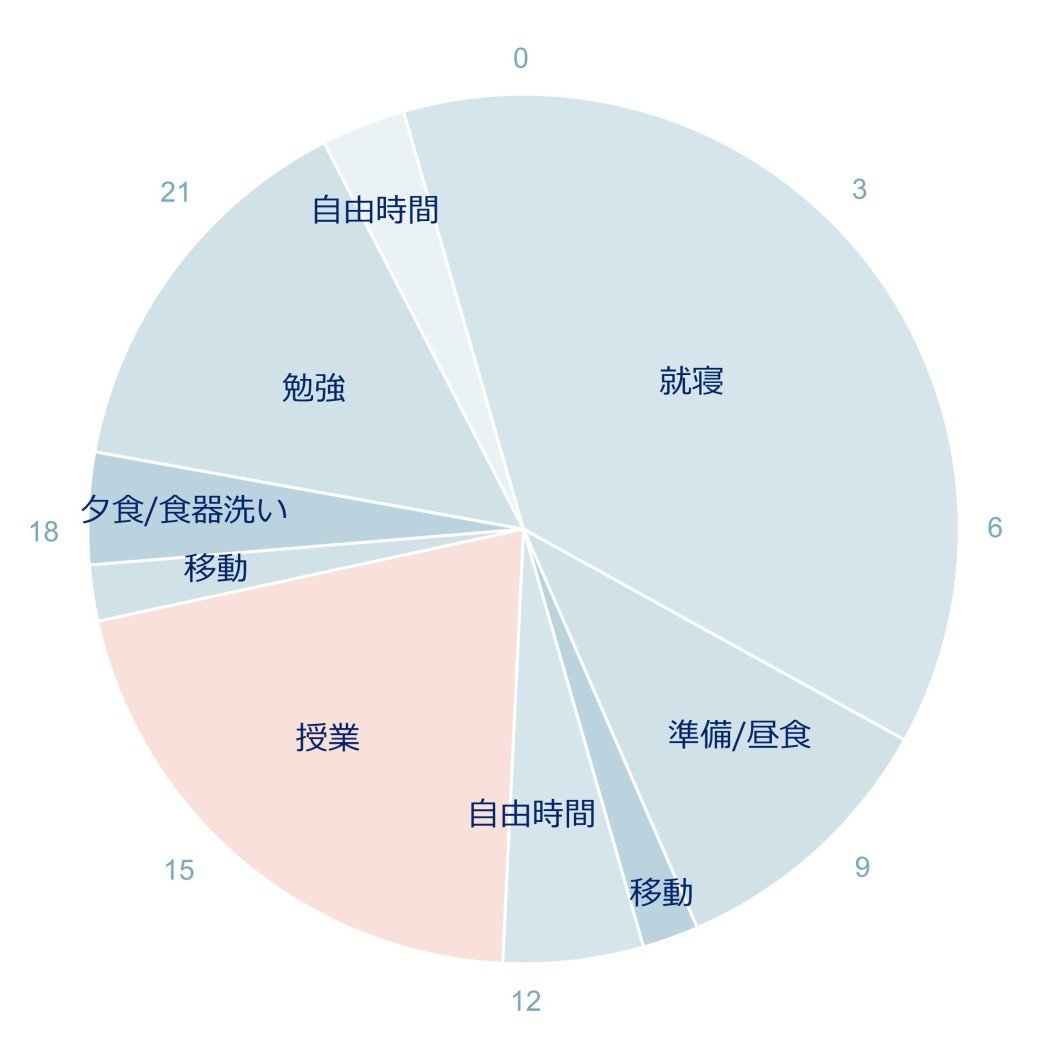 早めの昼食を済ませてから大学に移動し、自由時間を楽しんだ後、授業に参加します。帰宅後、夕食は主に自分で作ります。その後は勉強に集中し、次の日の授業や研究に必要な準備をします。就寝前には自分の趣味の時間を過ごし、リラックスしてから一日を終えます。