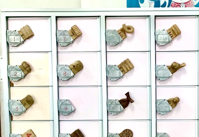 銭湯の下駄箱には、学生とのコラボによってつくられた珍しい木札が使われています。