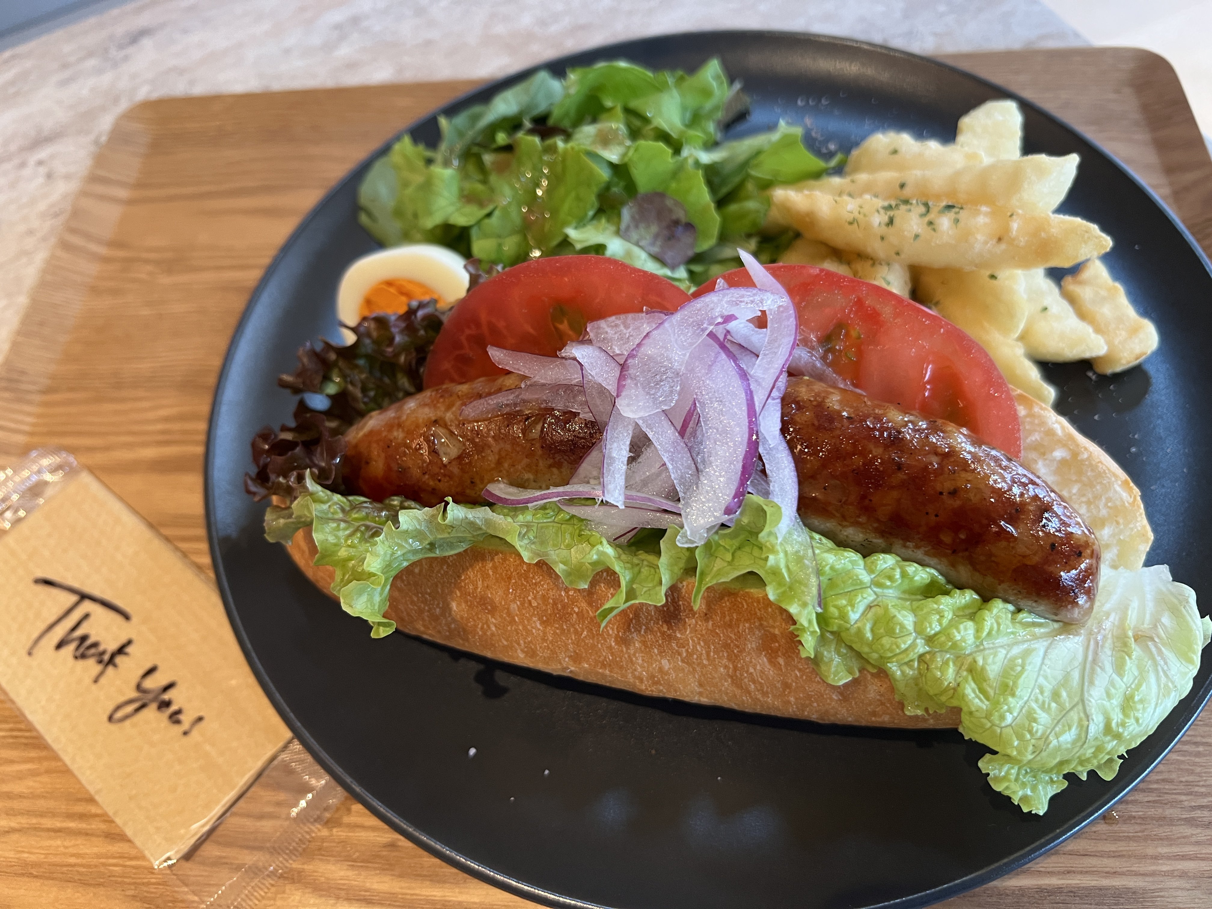 くつろぎのお供にオススメのフードはホットドッグです。以前サギタリウスでも取材し、食べログの百名店2022にも選ばれている「ブリアン京都北山本店」のホットドッグ用パン、京賀茂野菜、無添加・防腐剤不使用の京都産もち豚100%ソーセージを使用しています。ケチャップやマスタードは不使用で、こだわり素材の味を存分に楽しめます。ソーセージは燻製の香りと肉の旨味が感じられ、みずみずしい賀茂野菜と最高にマッチします。とてもおいしかったです!
