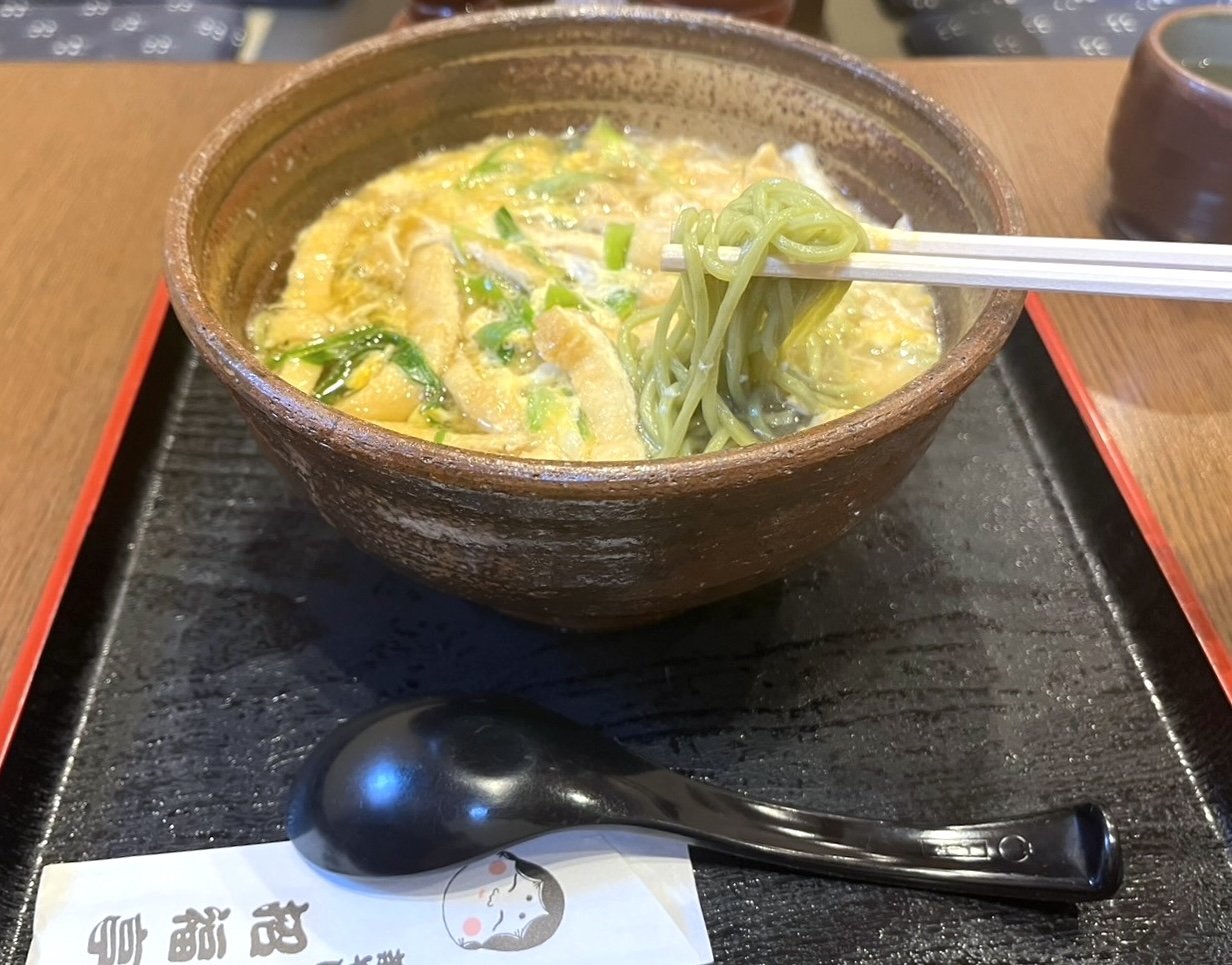 「衣笠」の具材は油揚げ、九条ねぎ、溶き卵。ふんわりとかかった卵が優しい味わいでした。招福亭の名物である「茶そば」は、抹茶が練り込まれたそばで、京都らしさを感じることができます。もちもちとしていて抹茶の風味がおいしかったです。