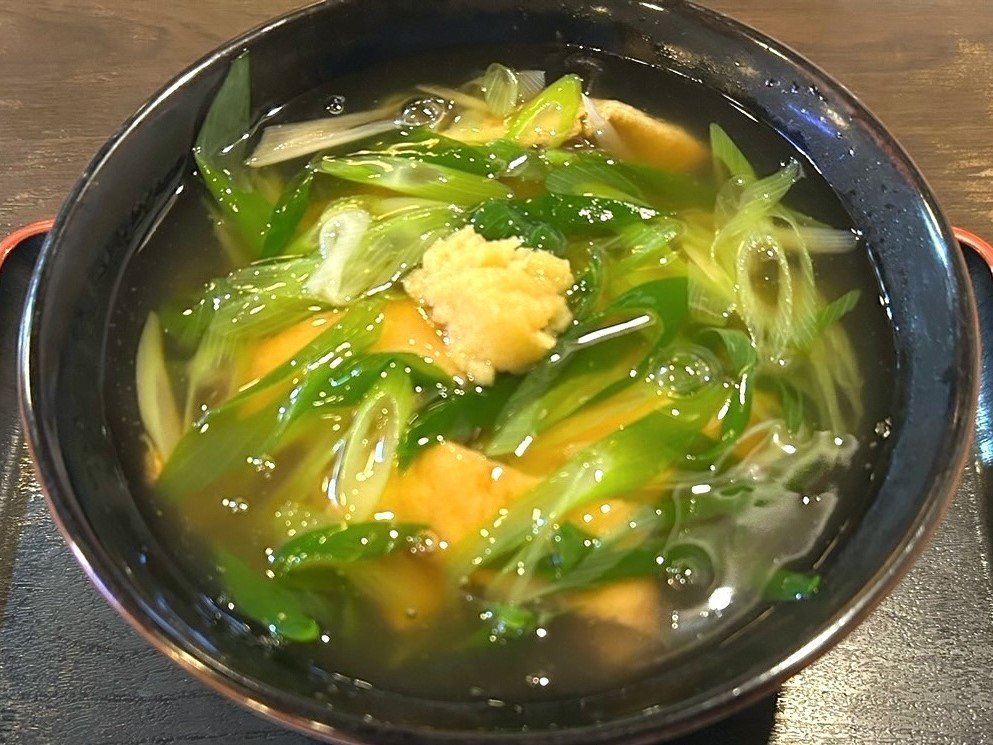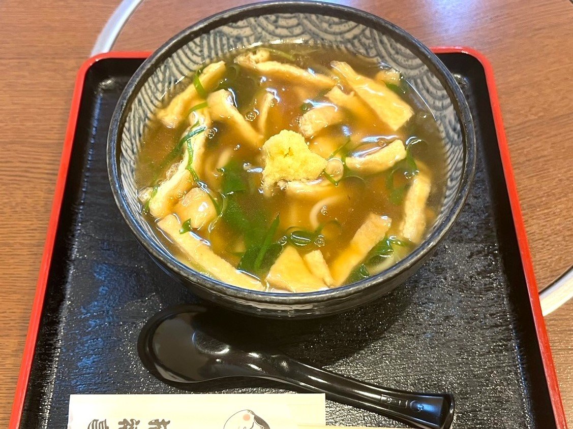 「たぬき」は、あんの中に甘く煮た油揚げと九条ネギが入ったうどんです。濃厚なあんと一緒に うどんを食べると、麺のコシと濃厚なあんのとろっとした食感がおいしかったです。その中で、ねぎの食感、そしてトッピングされている生姜の風味が良いアクセントになっていて、甘い油揚げとの相性が楽しめました。