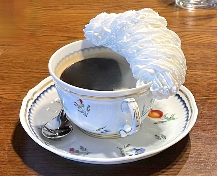 「ウインナーコーヒー」も特徴的で、コーヒーの上にクリームを絞るのではなく、カップの縁にたくさん、フリルのように盛られています。とてもかわいらしく見とれてしまいました。レモンが加えられたクリームは、さっぱりとした甘みと爽やかな酸味があり、コーヒーの苦味とマッチして美味しくいただけました。