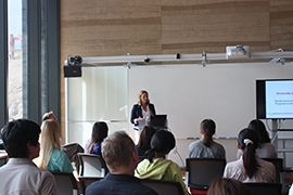 ドイツ留学説明会ではまず全体に、ケルン大学についてドイツ語と英語で説明が行われた。約40名の学生が参加し、全体説明の後には、ケルン大学の留学担当者に学生が質問をするなど終始和やかな雰囲気で行われた。
