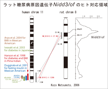 ラットの第8染色体領域に対応するのはヒト第11染色体長腕テロメア側。モデルラットとヒトの両方向から糖尿病原因遺伝子を決定できる貴重な場所である。