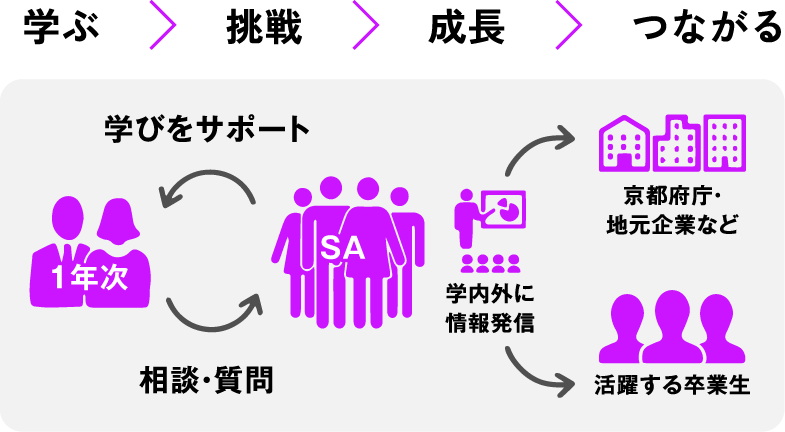 座学にとどまらず、企業・公共機関訪問や地域フィールドワーク、SA(スチューデント・アシスタント)活動など「行動」を通して学ぶ。知識を現場で使える力に変えるためのカリキュラムと実践機会を体系化します。
