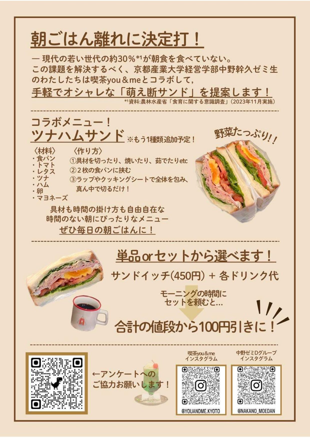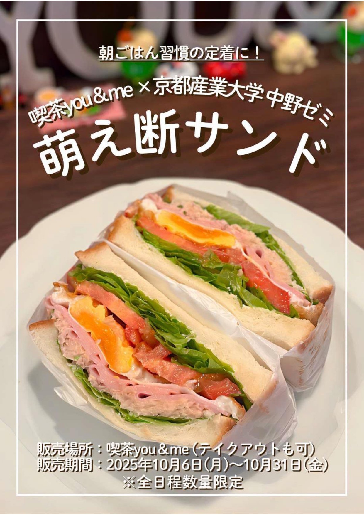 京都市左京区にある「喫茶you&me」にて、経営学部中野ゼミ19期生6人(梶本 佳歩さん、田村 淑乃さん、早田 紗彩さん、村上 春留さん、山中 千怜さん、岸本 沙耶、いずれも3年次生)が共同開発した「萌え断サンド」の販売をしています。2025年10月31日(金)までの期間限定で、数量限定です。「喫茶you&me」は、叡山電鉄元田中駅から徒歩約5分です。出町柳駅や一乗寺方面へお出かけの際は、ぜひ立ち寄ってみてください。