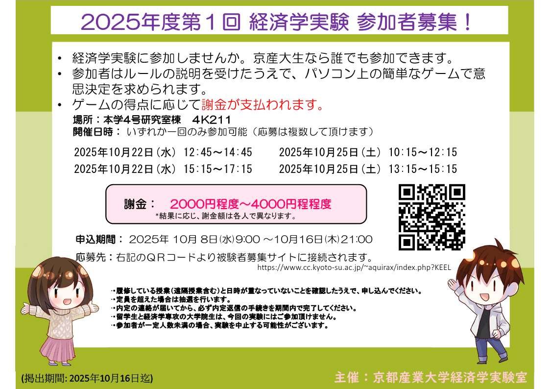- 留学生と経済学専攻の大学院生は、今回の実験にはご参加頂けません。