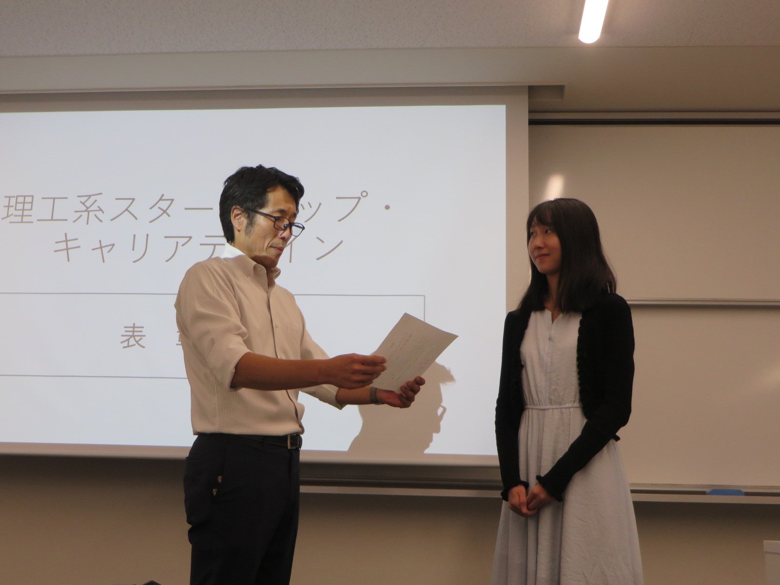 9月26日(金)に、理工系学部(理学部、情報理工学部、生命科学部)の1・2年次生を対象としたキャリア形成支援教育科目である「理工系スタートアップ・キャリアデザイン」の企業訪問報告会を開催しました。受講生、担当教職員に加えて、ご協力いただいた訪問先企業9社のご担当者など26名が参加しました。また、審査員をお招きし、発表内容についての質問やコメントを頂きました。