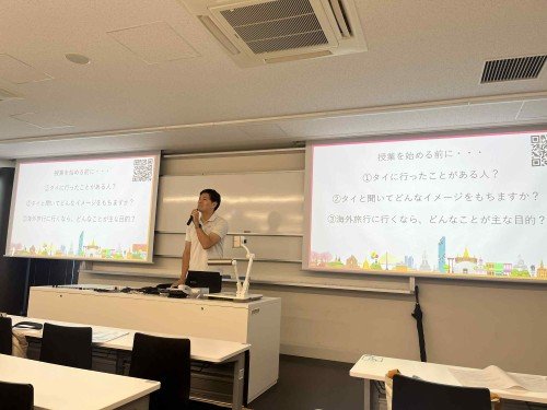 2025年10月15日には、タイ国政府観光庁大阪事務所よりマーケティングオフィサーの冨松寛考氏および平田篤宣氏をお招きし、「広告実践演習」の授業内で課題の詳細や日本市場におけるタイ観光の現状についてご説明いただきました。
