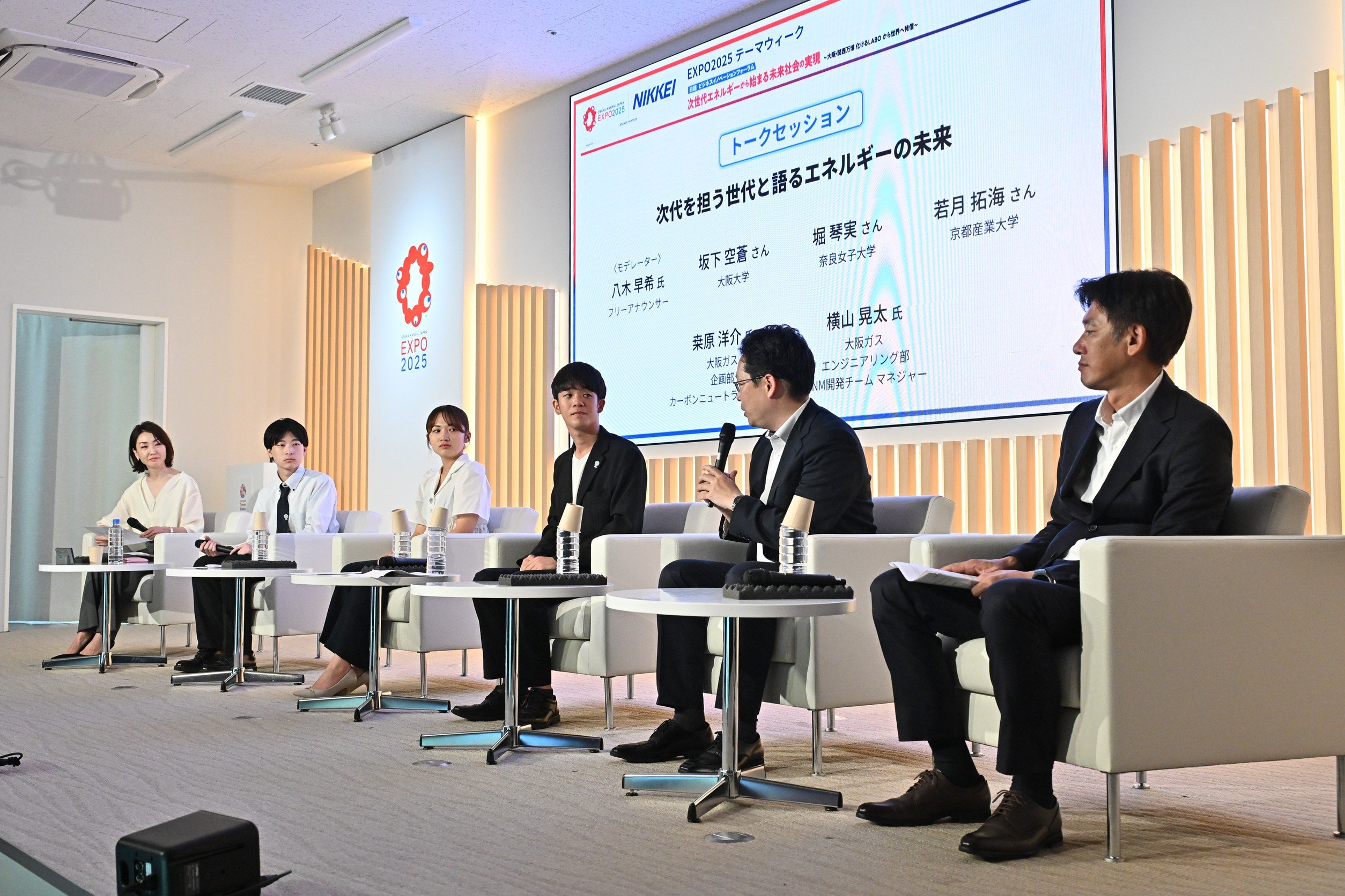 続いて、トークセッションでは、大阪ガス株式会社とともに本学経済学部4年次生の若月さんのほか、他大学工学部(基礎工学部)生も登壇し、技術的ハードルの乗り越えだけではなく、経済的に成り立つのか、社会システムに組み込めるのか、人々にどの様にして受け入れられるのかを多角的に検討するといった、技術と社会の接点について、未来を生きる若者の観点からトークセッションが繰り広げられました。