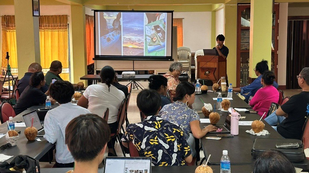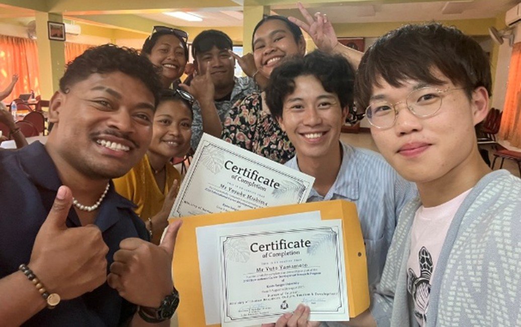 プログラム終盤には、各学生が Palau Resource Institute(PRI、パラオプログラム受入協力NGO)やインターン受け入れ先の関係者、ホームステイファミリー、在パラオ日本国大使館のスタッフに向けて、約3週間の滞在を通じて得た成果を発表しました。学生たちは、ホームステイでの生活経験や2週間を超えるインターンでの実務経験と調査をもとに、パラオが抱える課題とその解決に向けた方策を提案しました。発表に対しては、現地の関係者から高い評価と温かいコメントが寄せられ、学生たちにとって自らの成長を実感する貴重な機会となりました。プログラムの最後には修了証授与式が行われ、各学生が修了証を受け取り、報告会は終始温かな雰囲気の中で締めくくられました。