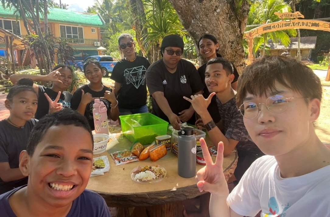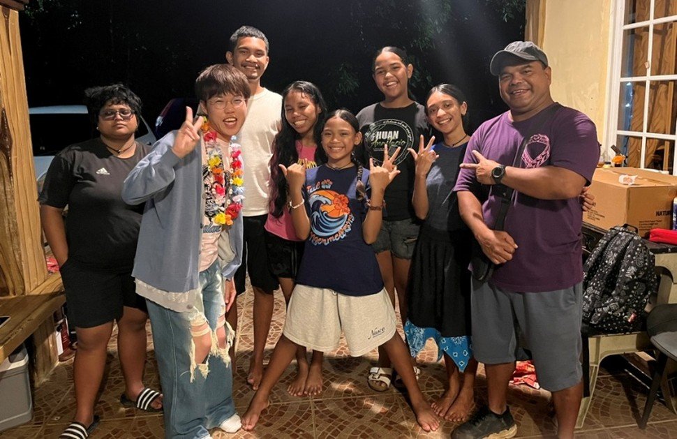 現地での活動中、学生たちはコロール州やアイライ州に分かれ、それぞれ現地の家庭にホームステイしました。私は父母と3人の子どもを含む6人家族のもとで生活し、温かい時間を過ごしました。家族はダンスが得意な親戚と親しく、毎日のように親戚が家を訪れては食事を共にし、ダンスの練習をしていました。私も仕事を終えた後、彼らと一緒に食事や会話を楽しみながらダンスに参加し、自然と輪の中に入っていきました。生活の中では、踊りや会話を通じて日本の文化や言葉を紹介する一方で、家族や親戚からパラオの文化や生活習慣を学ぶ機会も多く、互いの文化を尊重し合う豊かな交流が生まれました。また、ホストマザーは地域で顔が広く、スーパーに買い物に行くと知人が次々と声をかけてくる姿から、パラオ社会の人と人とのつながりの深さを実感しました。休日には家族や親戚とともにバベルダオブ島のココビーチ(Coco Beach)を訪れ、海やプールで遊びながら食事や会話を楽しみました。貝殻を探したり、写真を撮ったり、プールで飛び込みやバレーボールをしたりして過ごした時間は、笑顔にあふれた思い出となりました。こうしたホストファミリーや親戚との関わりを通じて、私自身の中に深い絆が生まれただけでなく、パラオ社会の地理的特徴や地域コミュニティのつながり、そして文化や慣習の豊かさを学ぶ貴重な経験となりました。