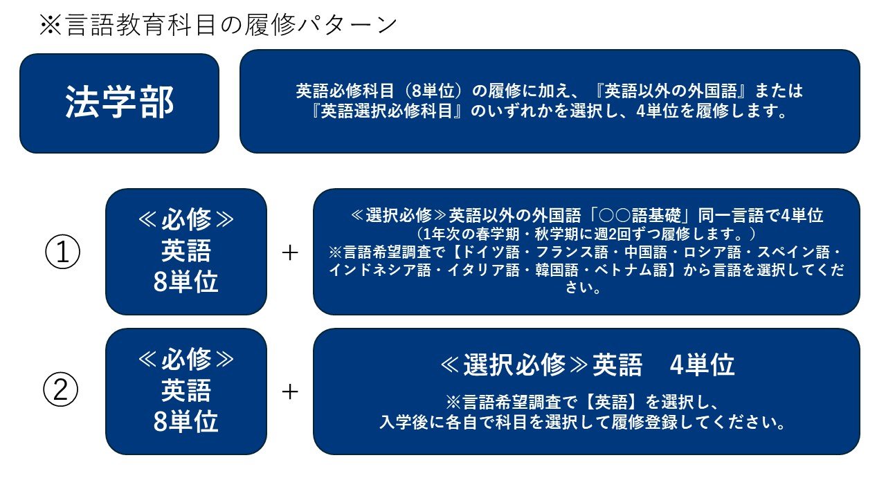 法学部の学生は、卒業までに「英語必修科目(8単位)」と言語教育科目の「選択必修科目(4単位)」を修得する必要があります。(※言語教育科目の履修パターン参照)