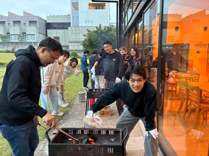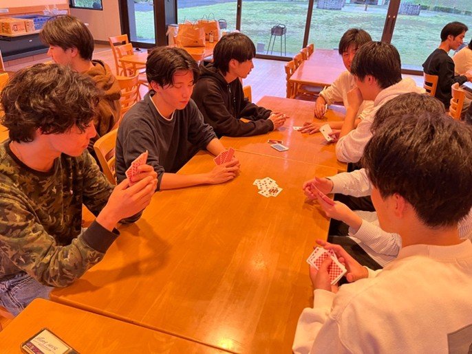 夕方には施設内でトランプやオセロ等を楽しむ学生たちの姿もありました。また夕食として、参加者全員でバーベキューを行いました。この頃には学生たちは皆打ち解けていたようで、大いに盛り上がりました。生憎の雨模様ではありましたが、それぞれが思い思いに楽しむ姿が印象的でした。