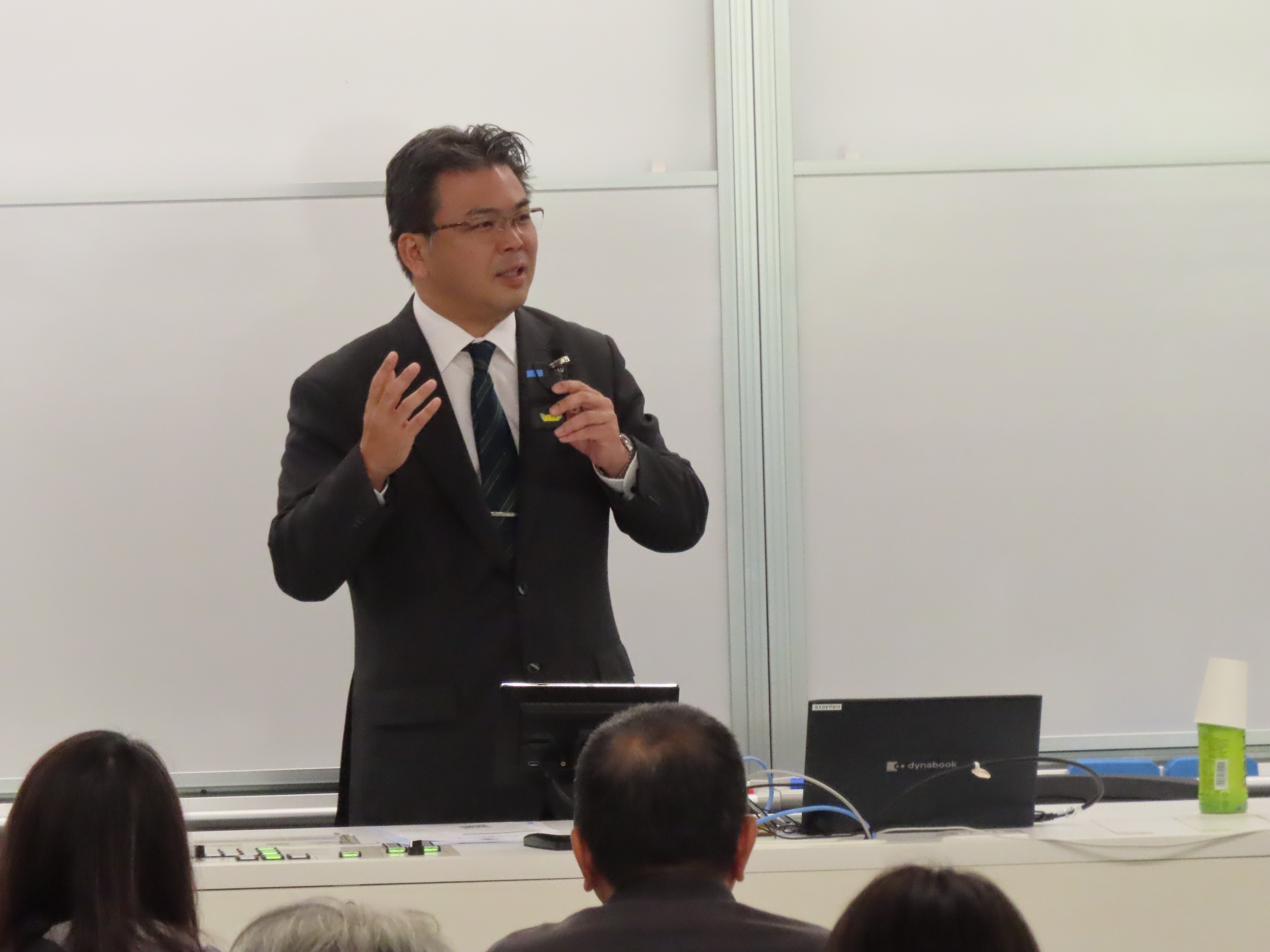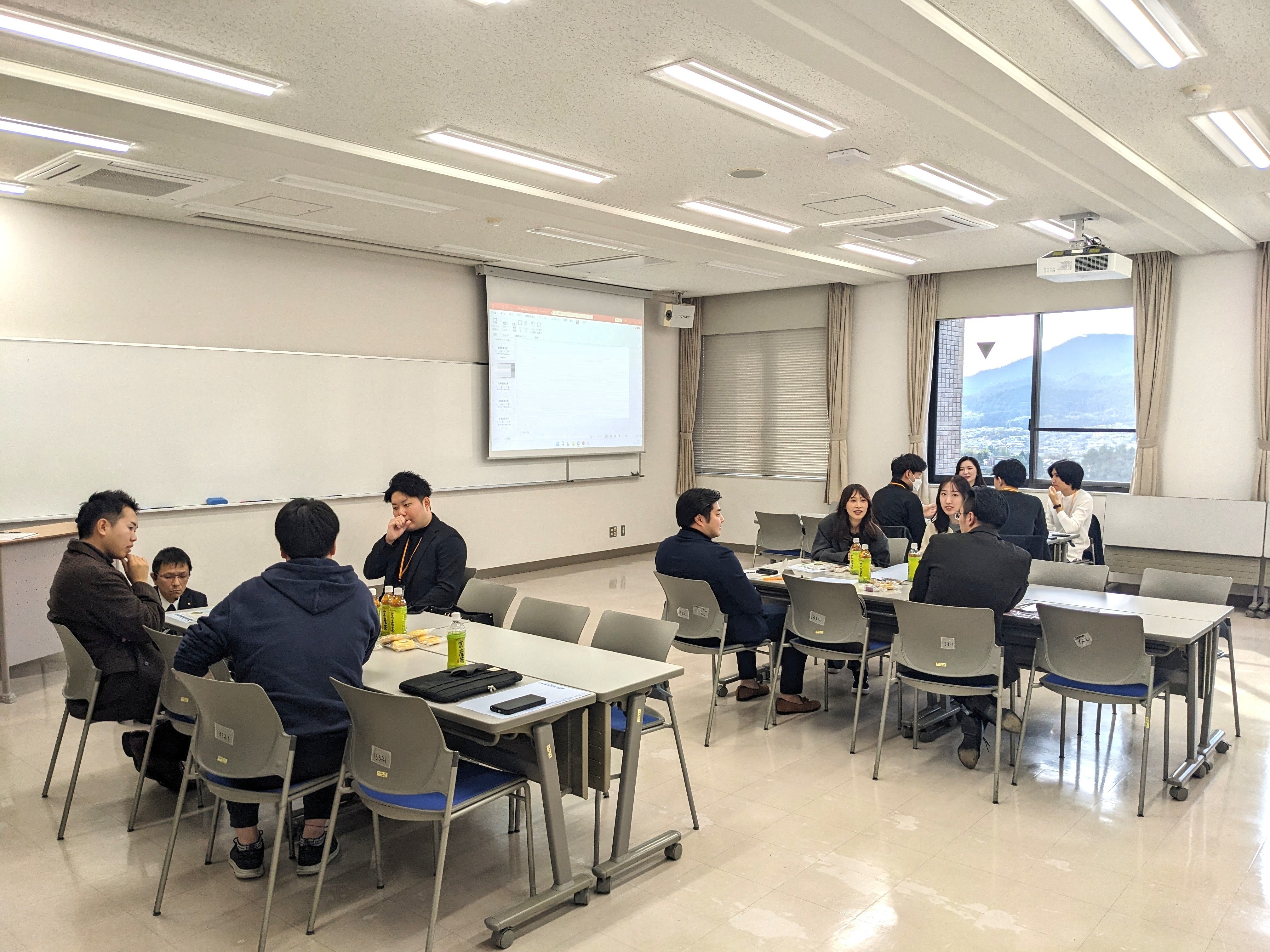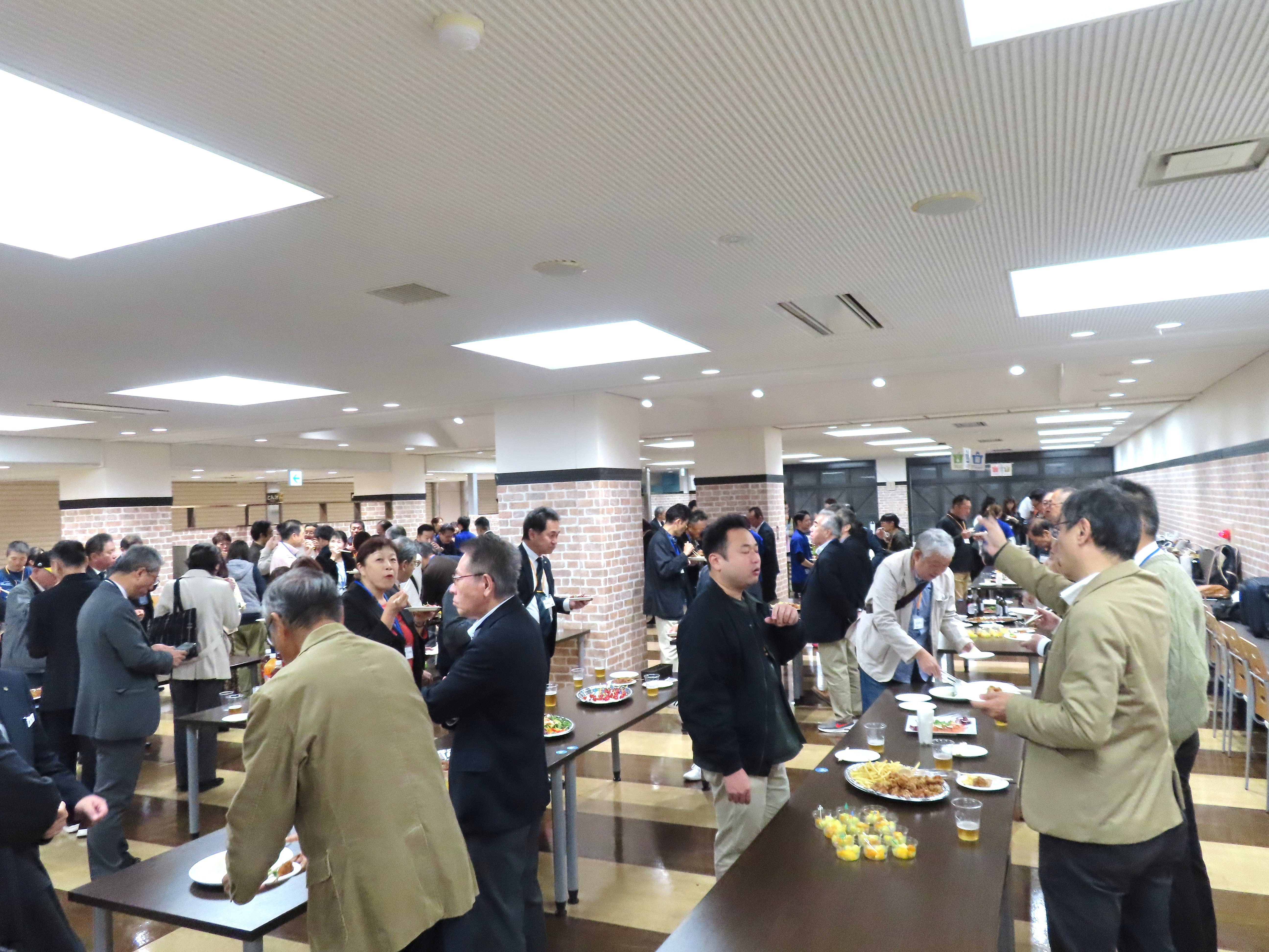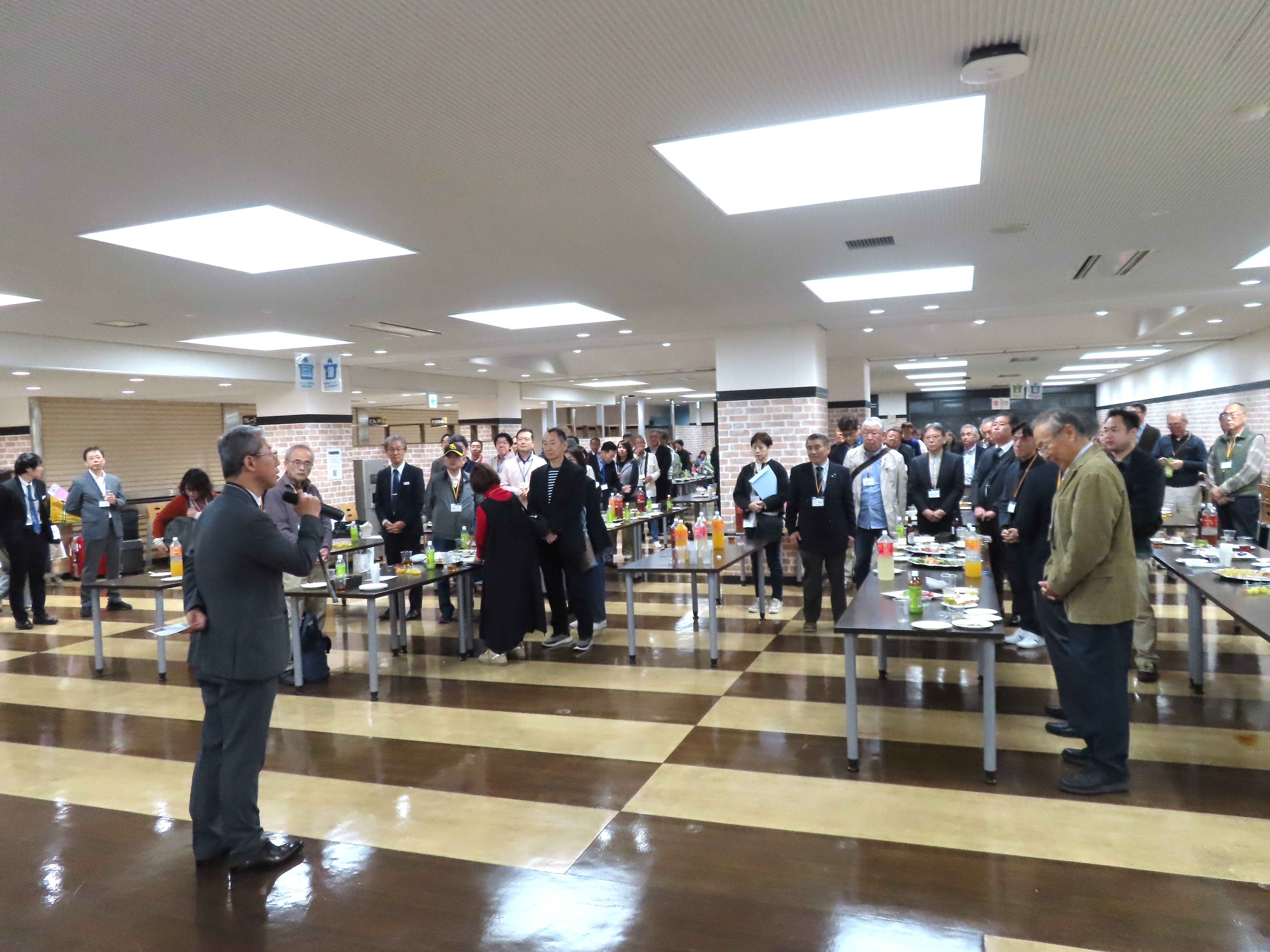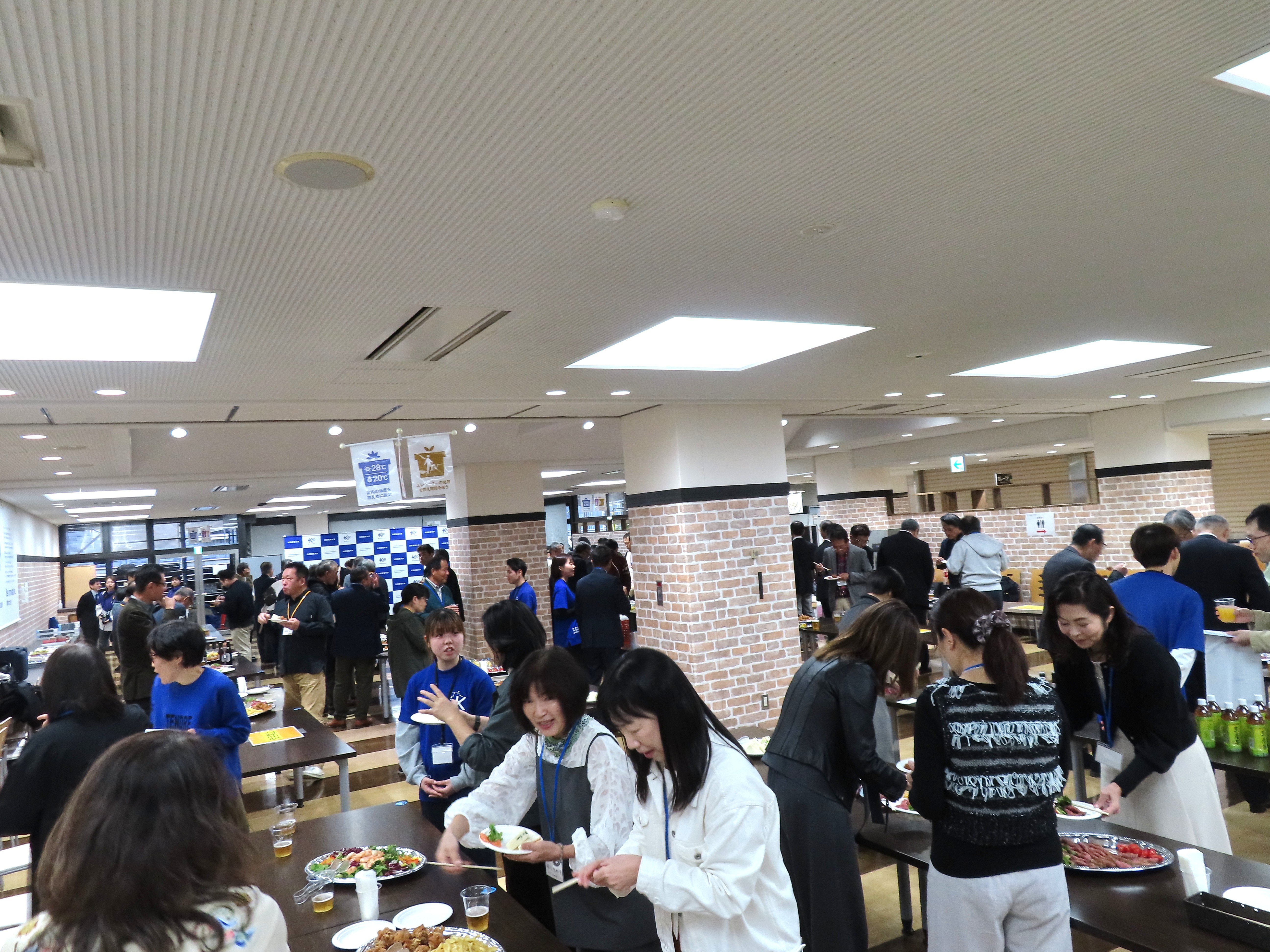 第二部の交流会では、立食形式にて、第一部で学生発表をした静原応援隊の学生に加え、教職員も参加し、卒業生と交流を行いました。最初に、参加教職員の紹介が行われ、その後、藤野副学長による乾杯があり、歓談が始まりました。参加した卒業生からは「久しぶりに友人たちに会えて楽しかった。」、「毎年開催して欲しい。」との声がありました。参加した静原応援隊の学生からは、「たくさんの卒業生からエールをいただいた。」、「多方面でご活躍されている卒業生からたくさんアドバイスをいただいた。」との声があり、学生・教職員・卒業生間でたくさんの交流がありました。
