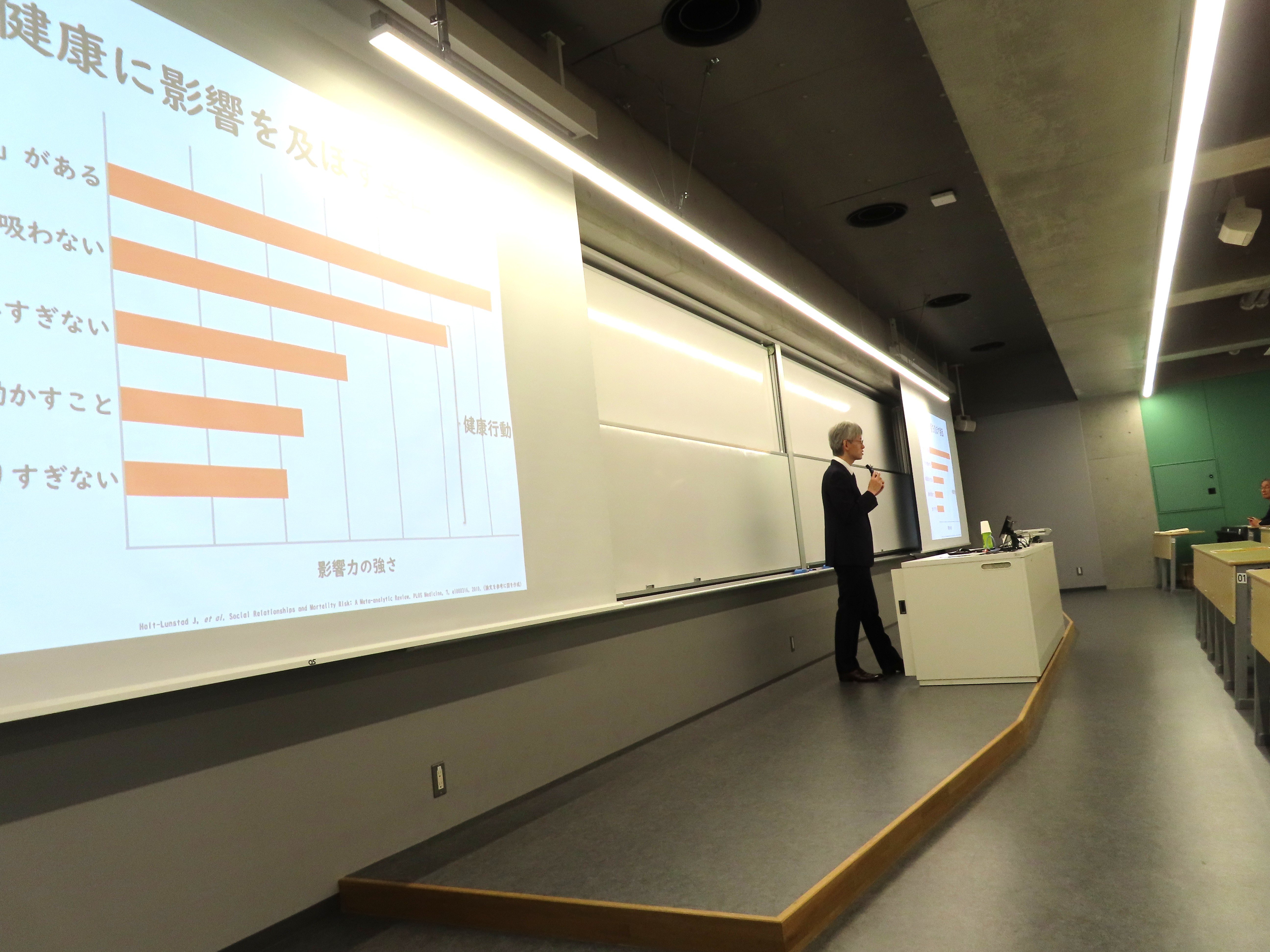 第一部の開会式では、在間学長の挨拶から始まり、筒井同窓会長による挨拶の後に、現代社会学部 濱野 強 教授による「健康長寿のために知っておきたいこと」をテーマに講演が行われました。その後、学生発表として、静原応援隊による活動紹介がありました。今回のホームカミングデーでは、来場者への記念品として、静原応援隊が作ったお米「星ふるさと」をプレゼントしました。学生発表の後は、全学応援団の力強い演舞で卒業生にエールを送り、第一部の開会式は幕を下ろしました。