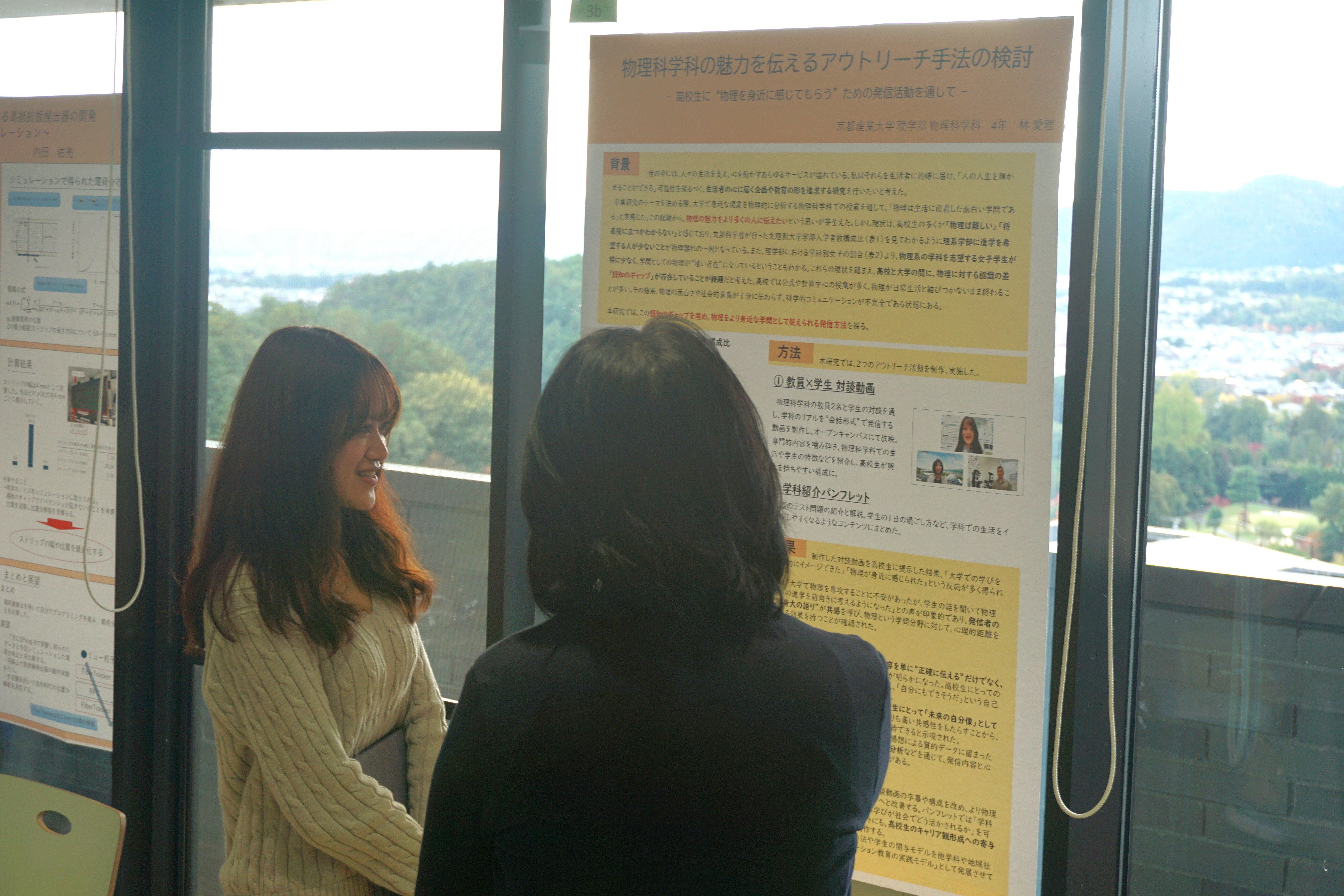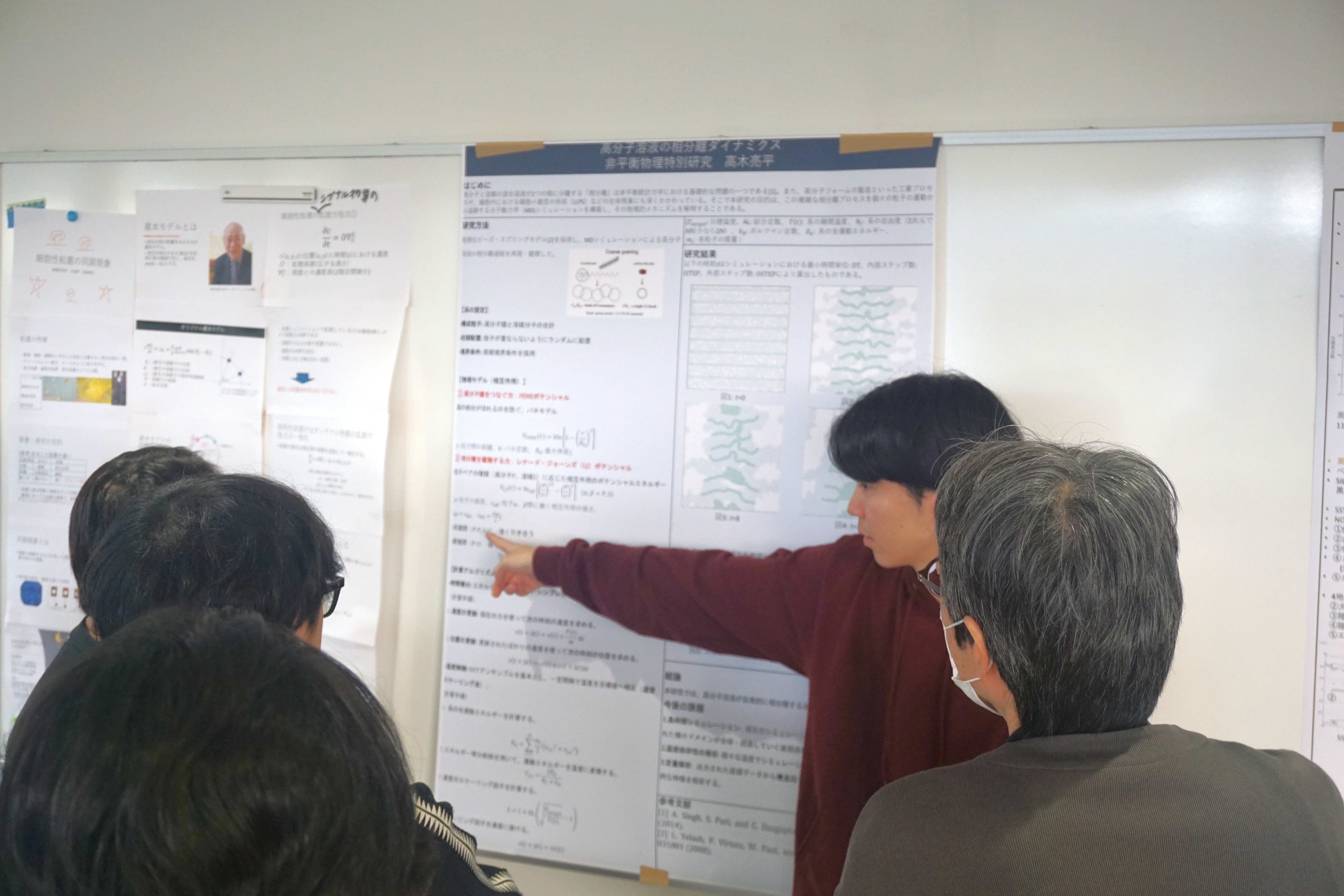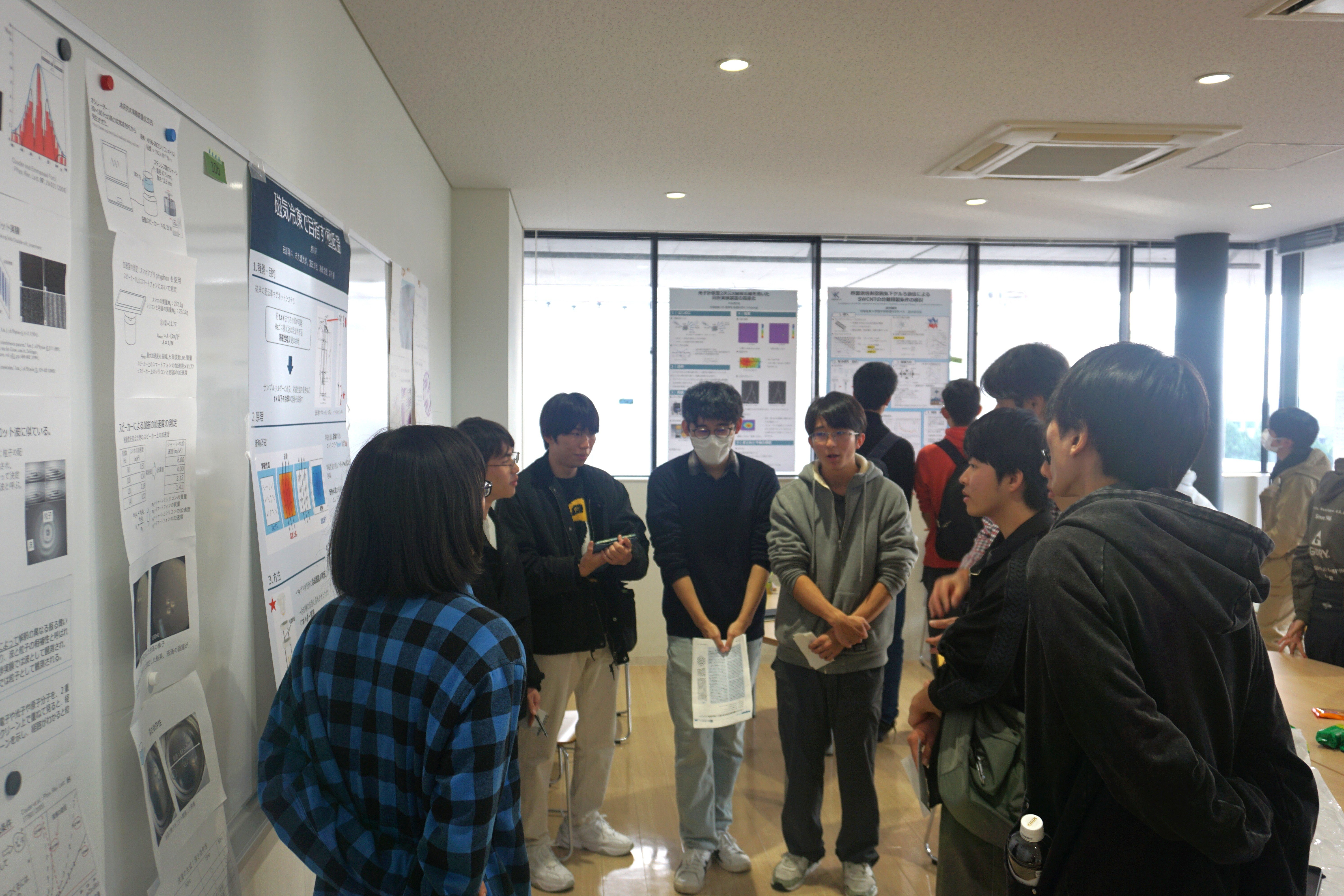 2025年11月12日(水)13:15から15:30まで、万有館4階サイエンスラウンジにて、理学部物理科学科の4年次生による特別研究の中間発表会を開催しました。
