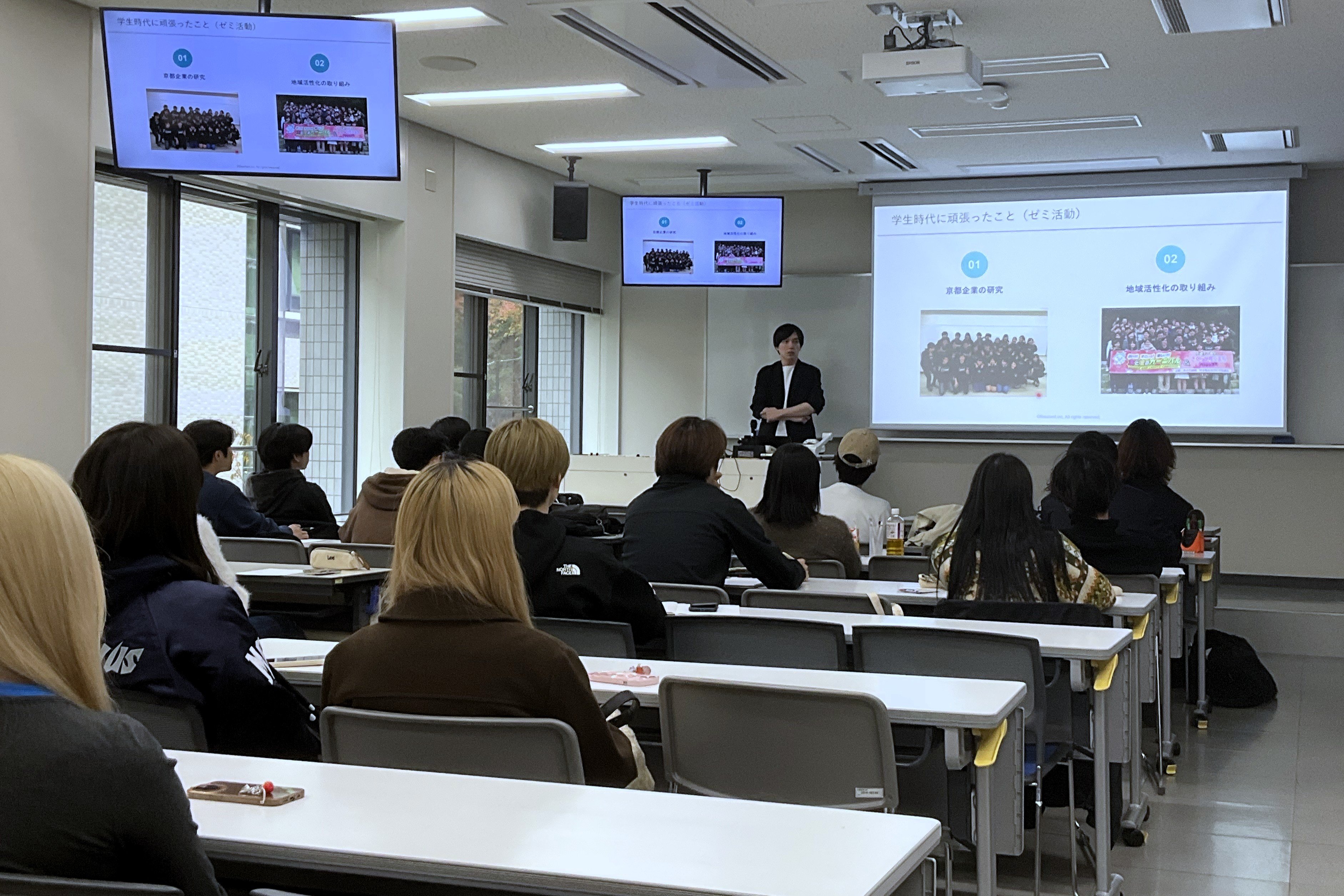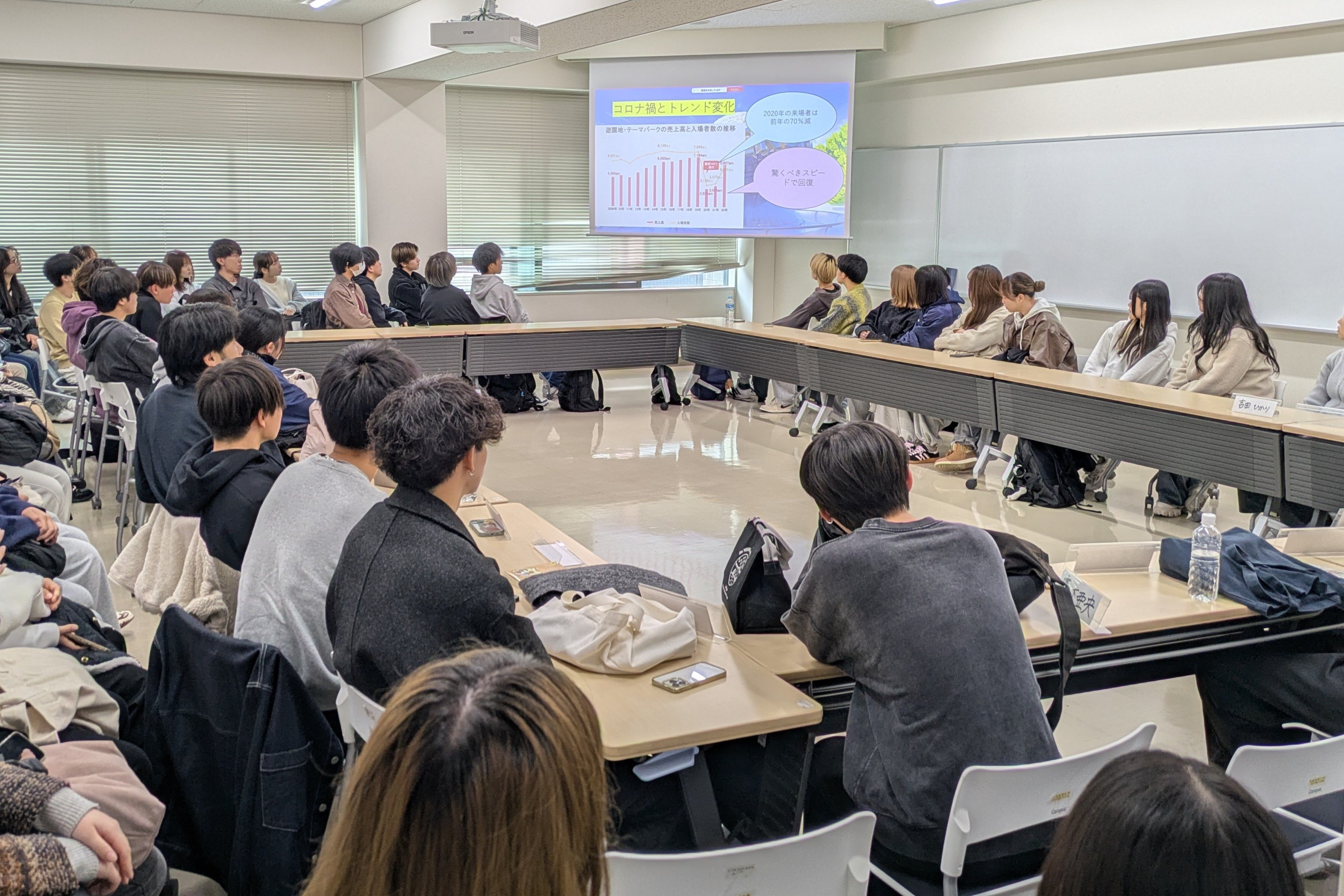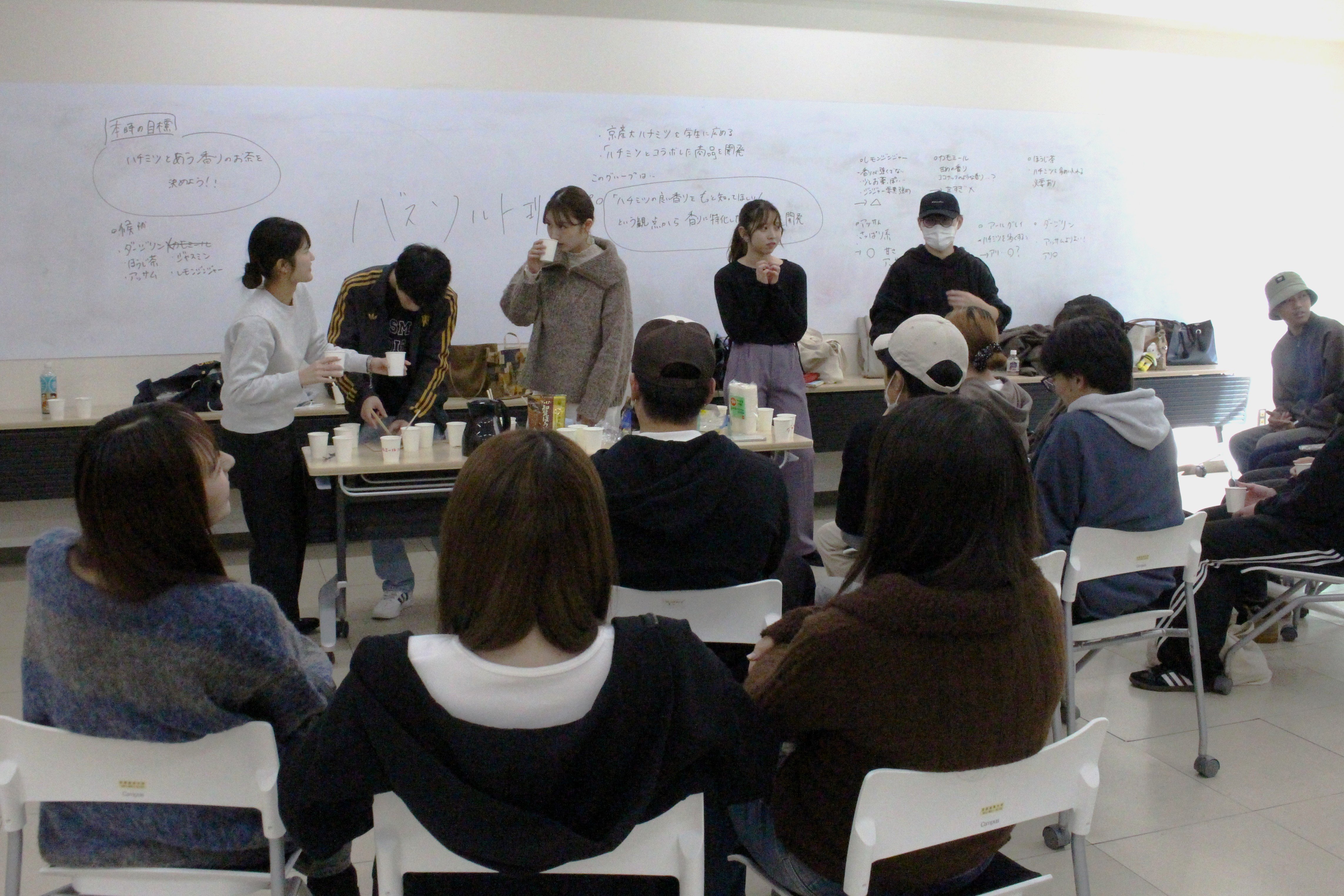 外部のゲストスピーカーの講義を多く取り入れるゼミや、企業とコラボレーションした飲料の試飲会を行うゼミもあり、それぞれ工夫をして、参加者を温かく迎え入れていました。参加者はメモを取り、先輩に熱心に質問するなど、ゼミ応募に向けて真剣な面持ちで、向き合っていました。
