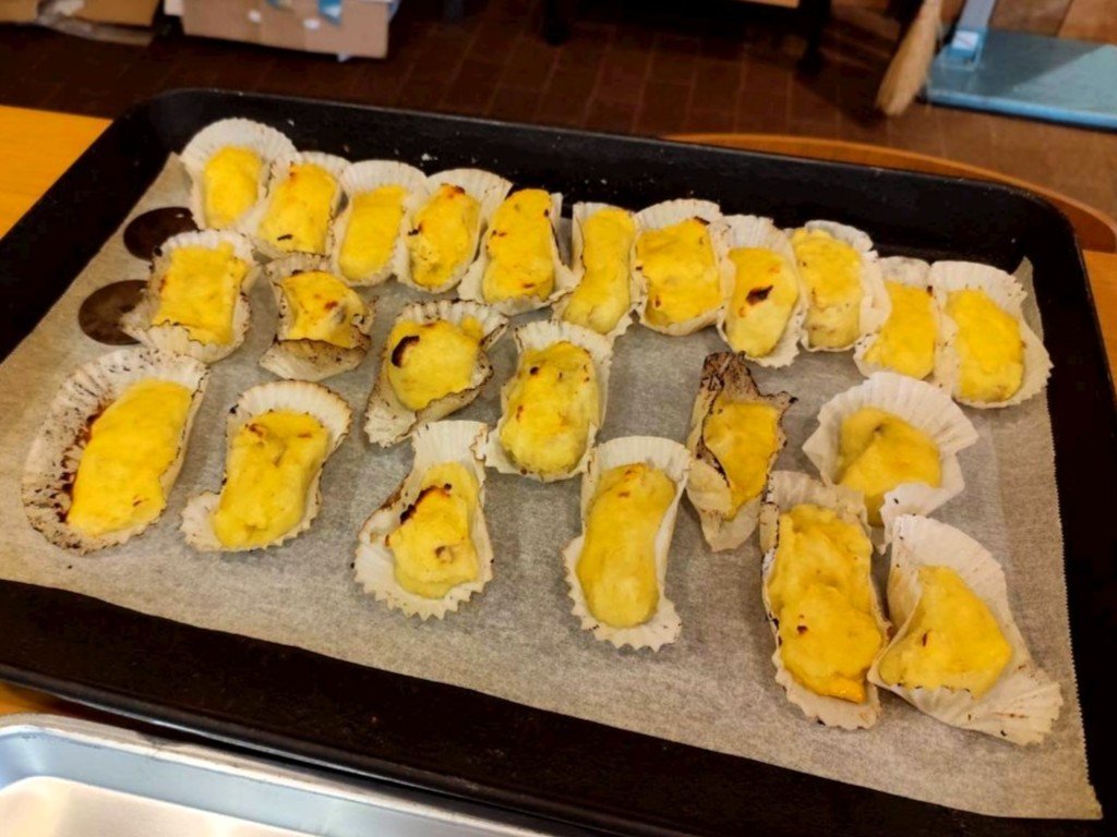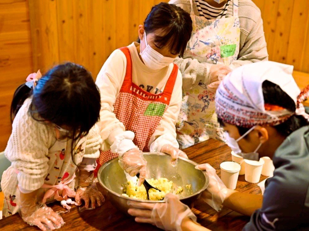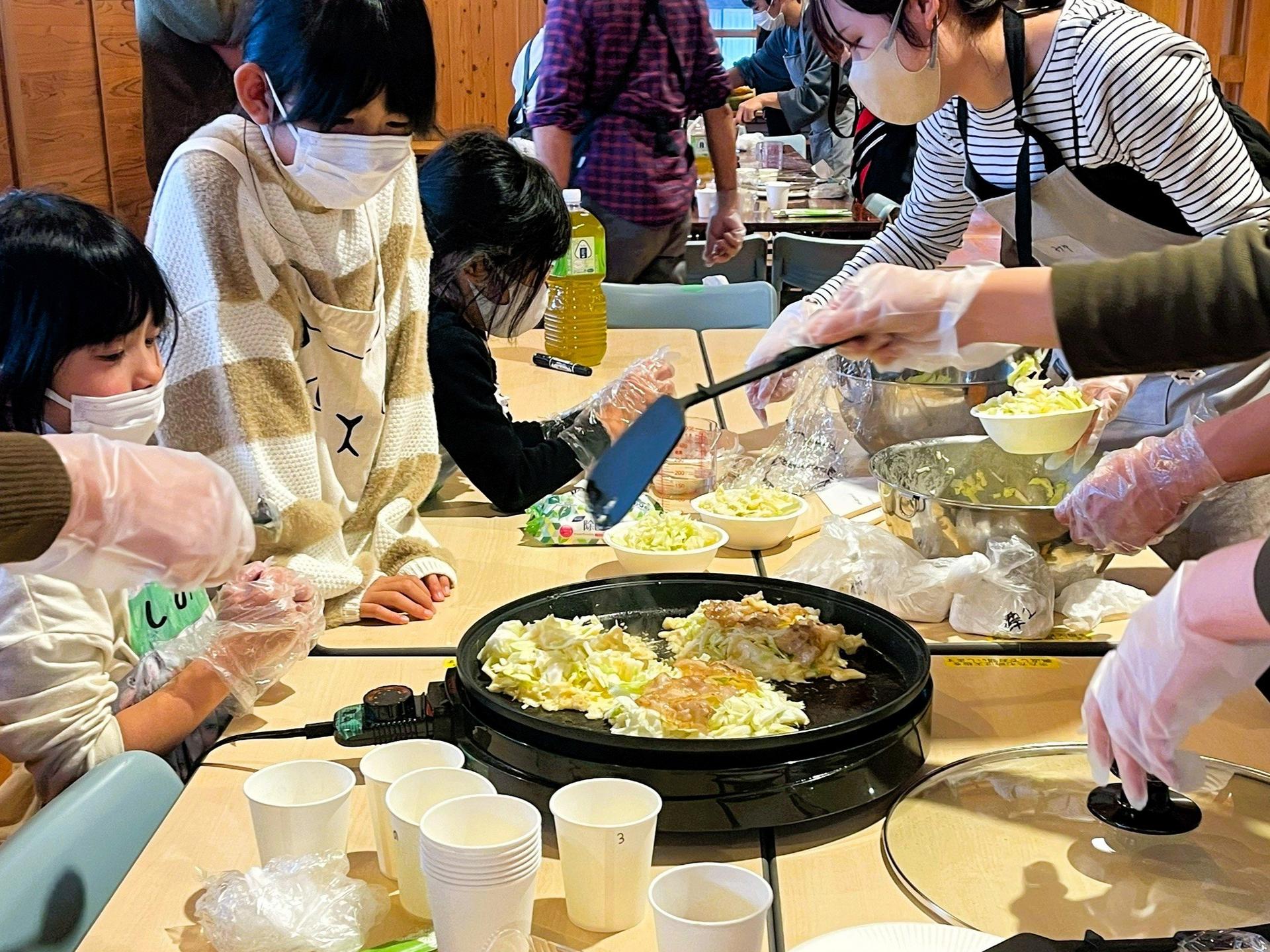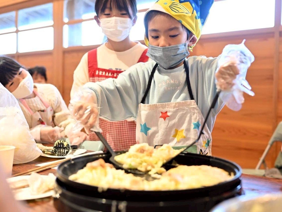 ゼミ生たちは、メニューの考案から食材や消耗品の購入、調理のアシスタントを担当し、綾部市の特産品であるKOKU(※)の米粉を使用したお好み焼きや地元で採れたさつまいもを使ったスイートポテト、小畑みその味噌汁を子どもたちと一緒に調理しました。