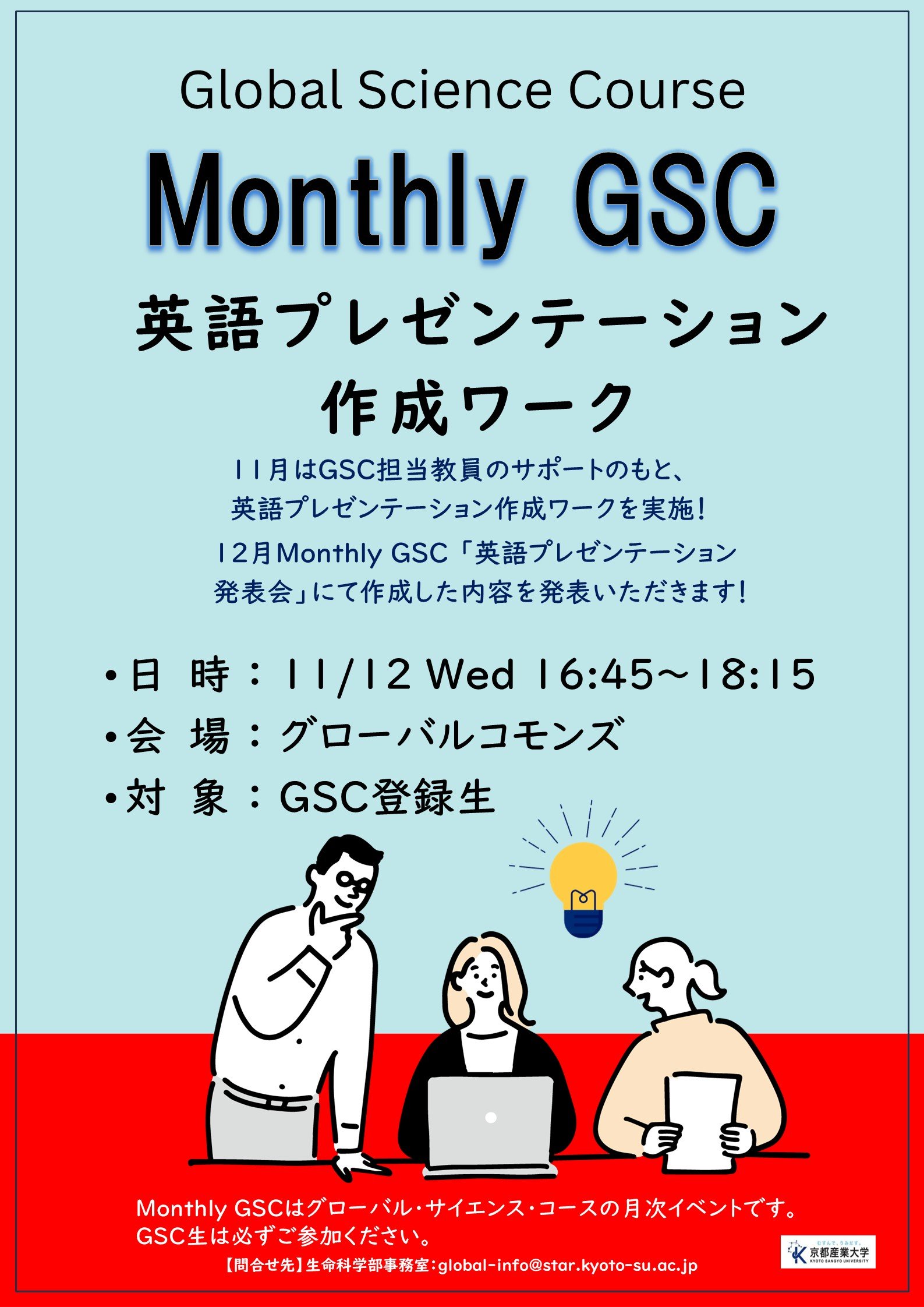 今回作成した内容は、これから各自でブラッシュアップし、12月のMonthly GSC「英語プレゼンテーション発表会」にて、1年次生はペアで、2年次生以上は個人で発表する予定です。GSC生の発表を是非見に来てください。