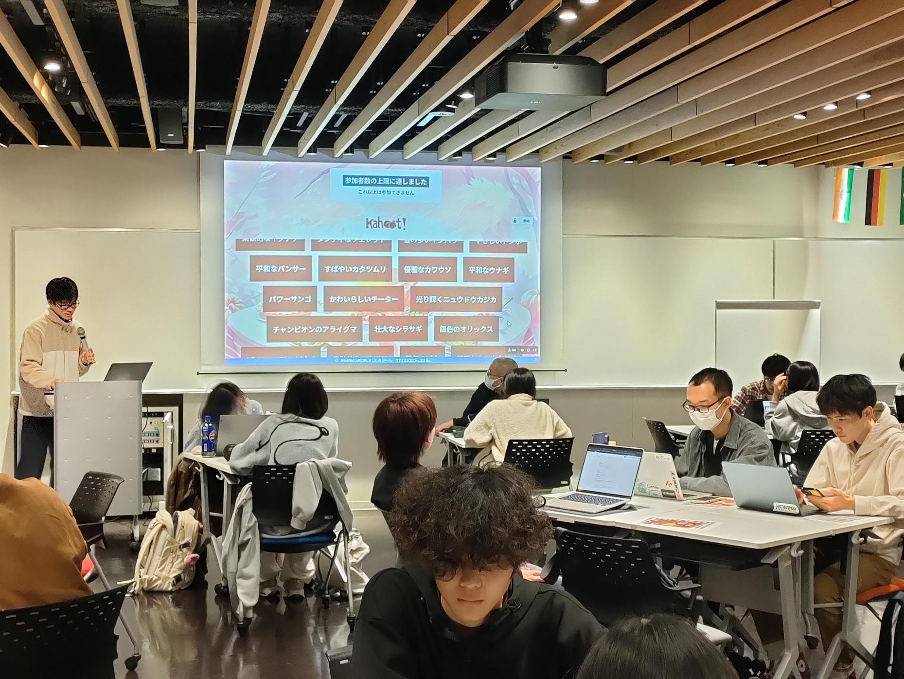 休憩時間には、GSC学生リーダーがお昼休みに開催中の「Kahoot!」(ミニ英語学習会)が実施されました。参加者は英語で出題されるクイズに参加し、正解が発表されるたび盛り上がりを見せていました。