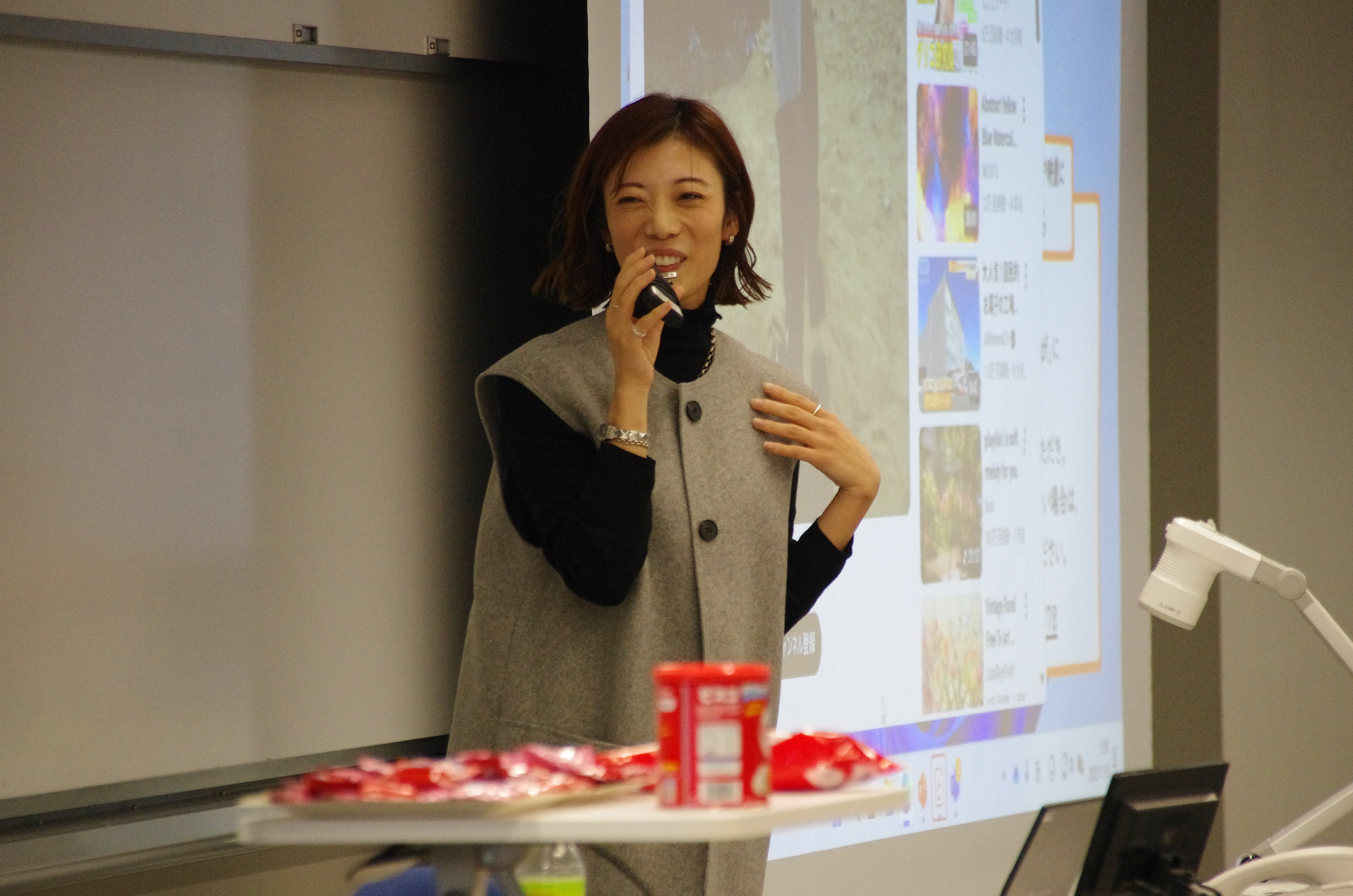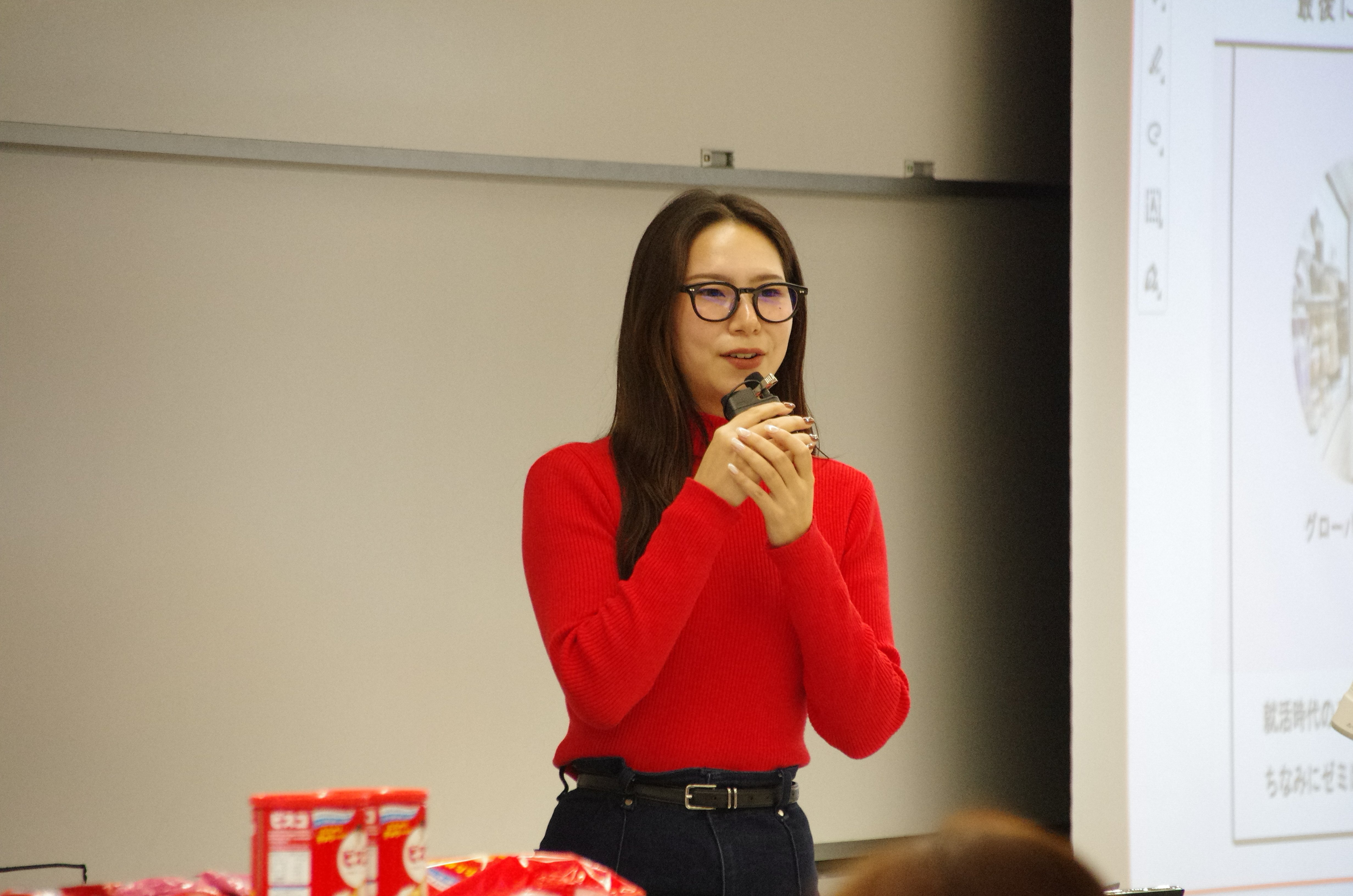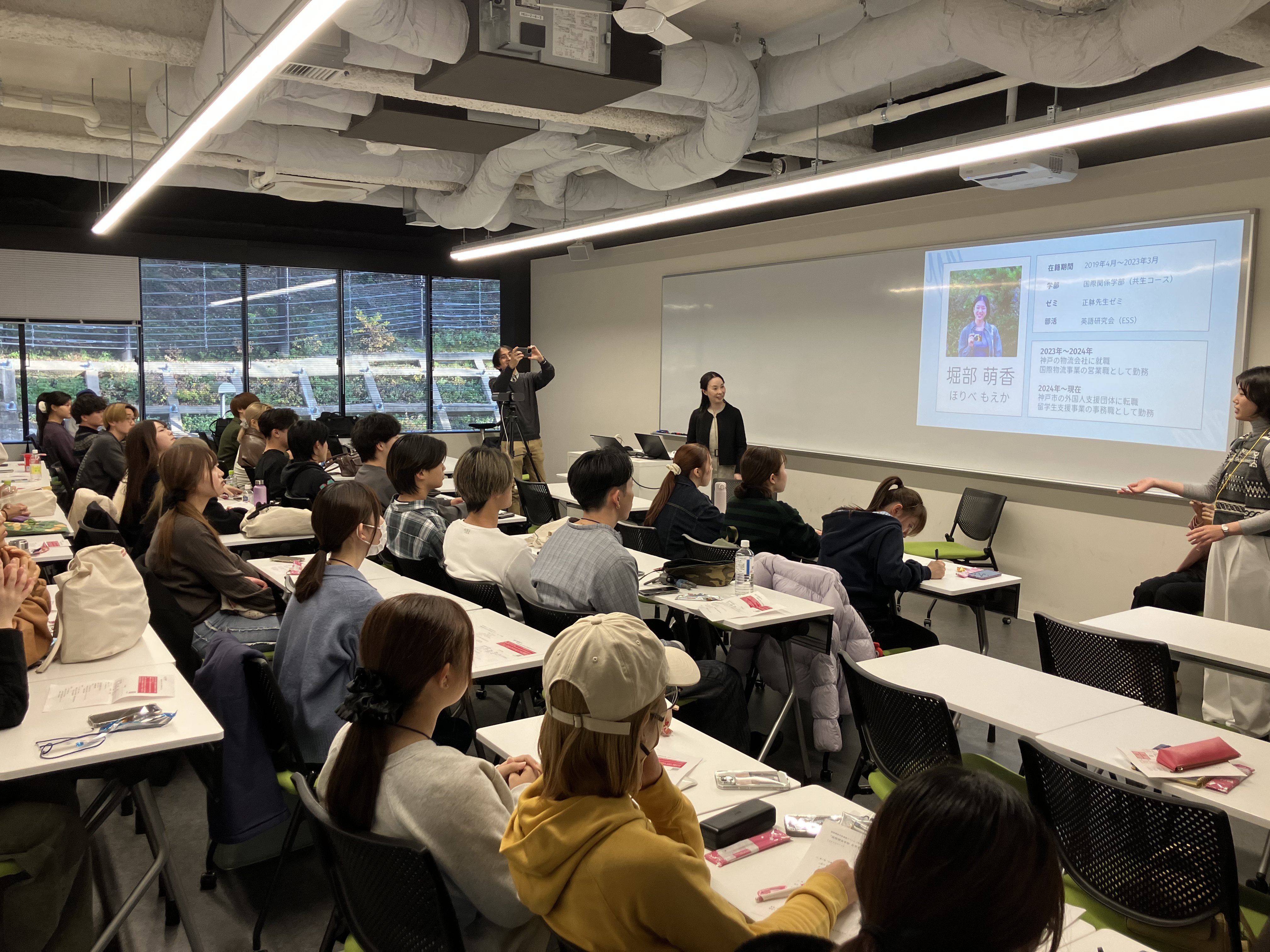 イベントは3部で構成され、第1部は卒業生2名に登壇いただき、在学生に向けて現在の職務内容や社会人の立場から学ぶことの大切さ、学生時代の目標や取り組みについて語っていただきました。国際関係学部で学び、社会で活躍されている卒業生の話に、在学生たちは熱心に耳を傾けていました。講演後は、これからチャレンジしたいと考えている目標から企業の成長戦略まで、多岐にわたる質問が出ましたが、ひとつひとつ丁寧に答えていただき、在学生にとってはこれからの進路を考えるにあたり、大変貴重な機会となりました。