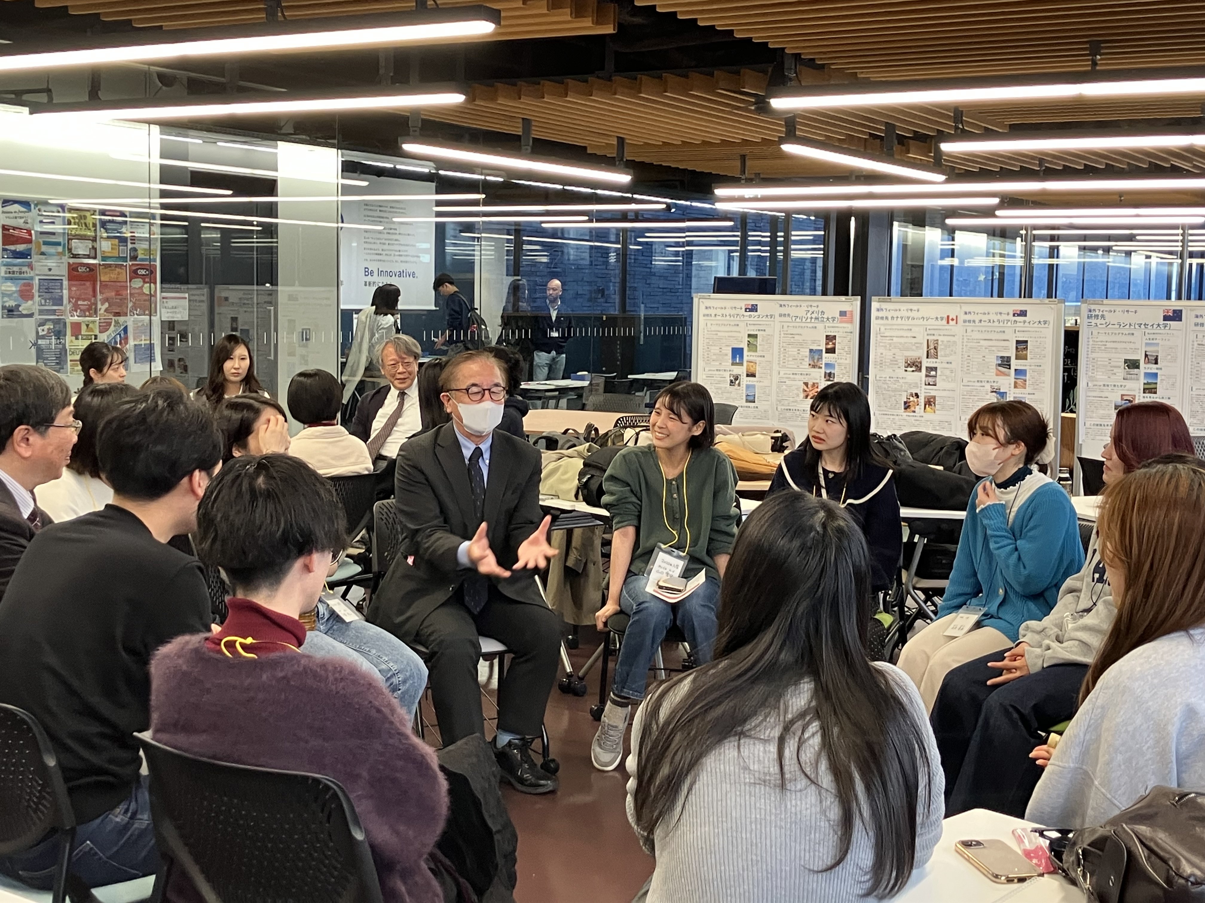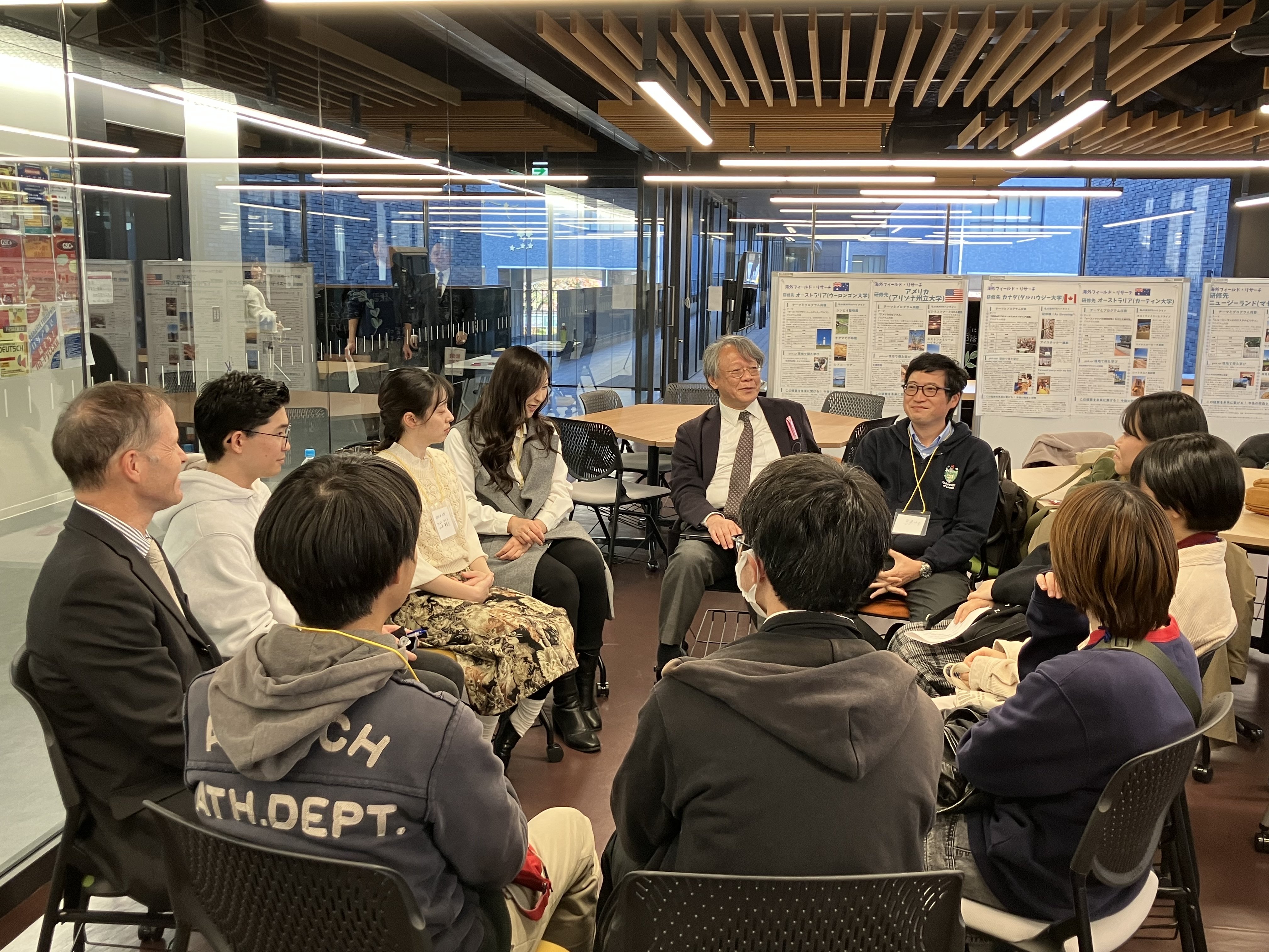 スチューデントコモンズには交流スペースが設けられ、集まった卒業生のグループに教員と在学生が参加し、在学当時の思い出や時事トピック等について自由に語り合いました。