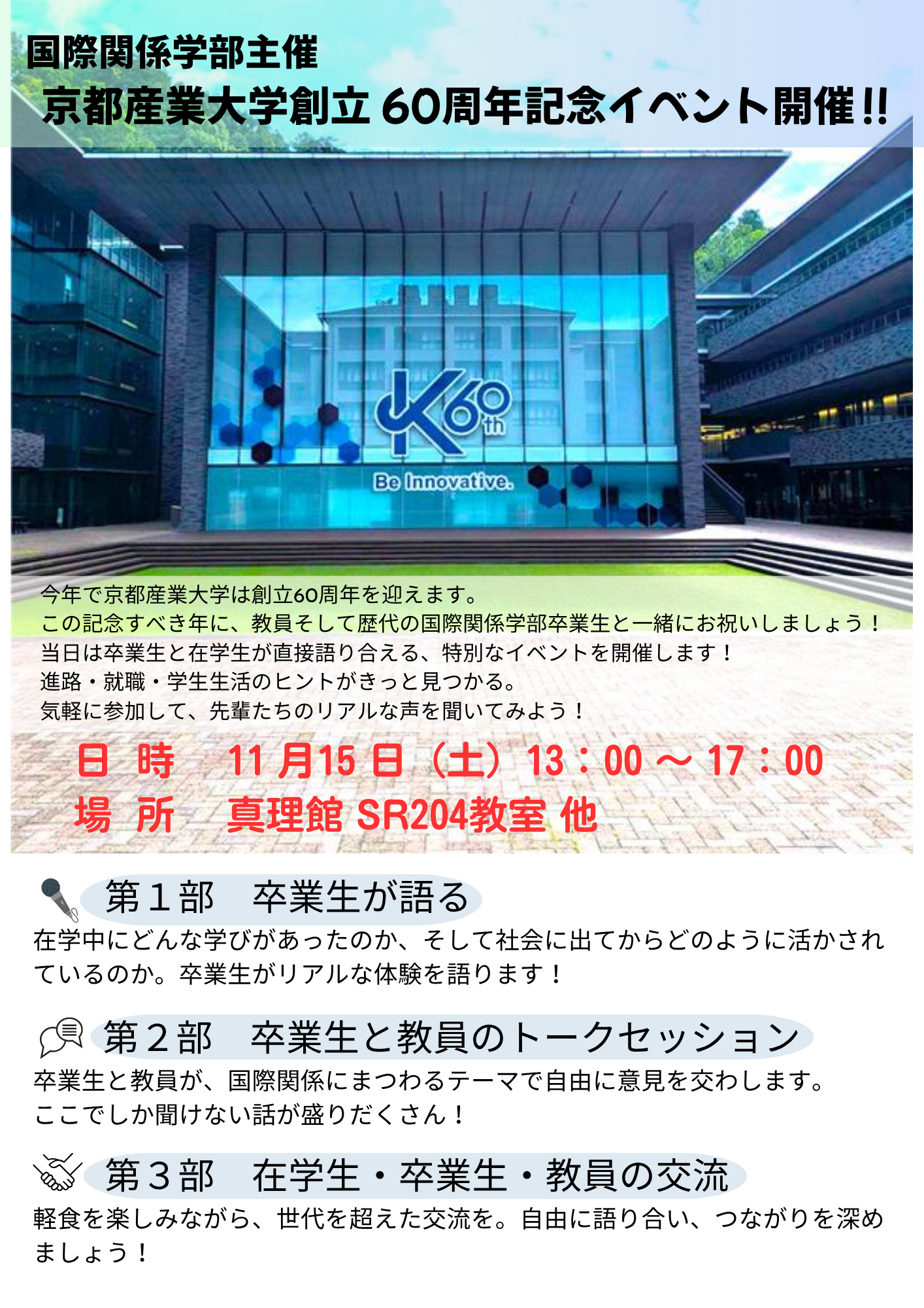 本学創立60周年という記念すべき年に、国際関係学部では卒業生・在学生・教職員のつながりを作るイベントを実施することができました。