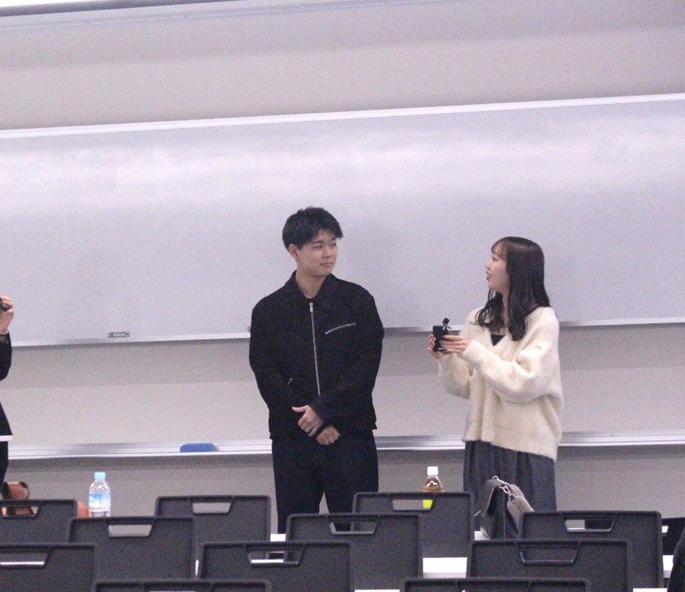 法学部独自のイベントとして、公務員公安職(警察)内定者による採用試験の体験報告会が開催されました。登壇したのは、京都府警察本部に内定した松野 史晃さん(服部ゼミ)、大阪府警察本部に内定した豊福 乃碧さん(岡本ゼミ・岡部ゼミ)の法学部4年次生の2人です。