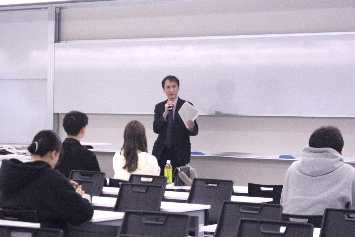 前半は内定者2名の報告会、後半は元警察本部長である法学部 岡部 正勝教授による講演会を行いました。岡部教授からは、警察官に求められる資質や覚悟についてのアドバイスもありました。
