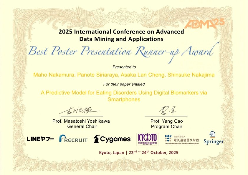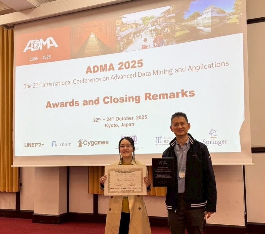 2025年10月22日(水)~24日(金)に京都大学にて開催された国際会議The 21st International Conference on Advanced Data Mining and Applications 2025(ADMA 2025)において、中村 真穂さん(先端情報学研究科 博士前期課程1年次/中島研究室)と中島 伸介 教授(情報理工学部)の共著論文が Best Poster Presentation Runner-up Award を受賞しました。本国際会議はデータマイニングやそのアプリケーションに関する学術的会議であり、200名以上の参加登録があり、150件以上の論文発表が行われました。