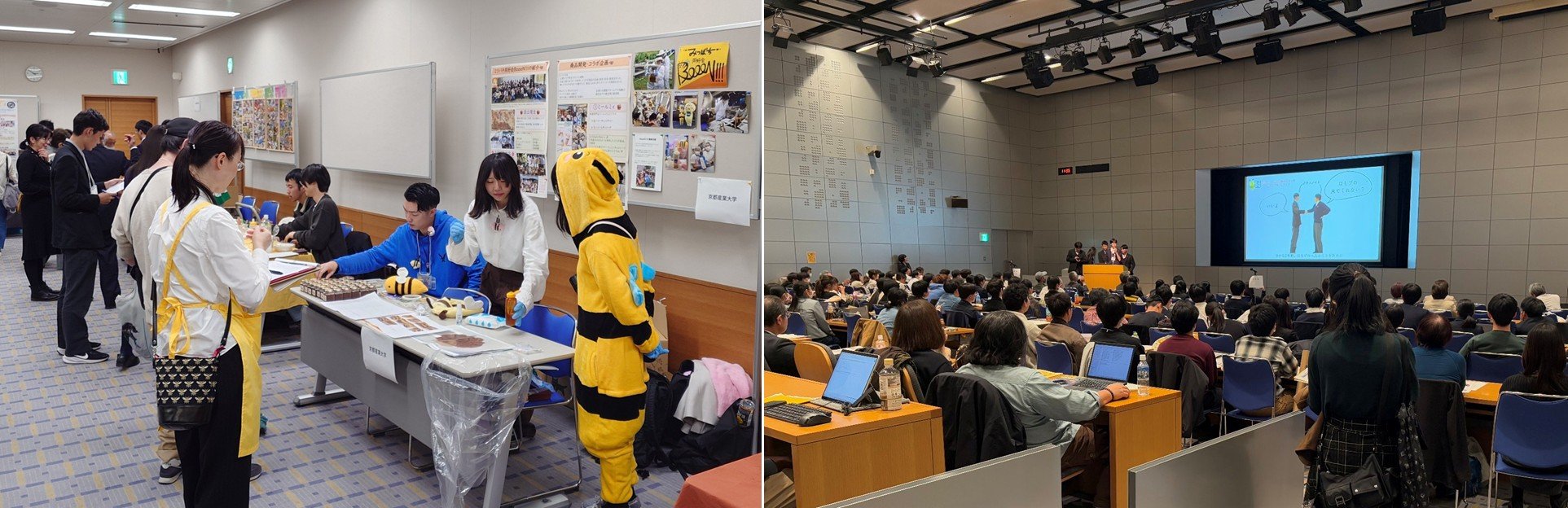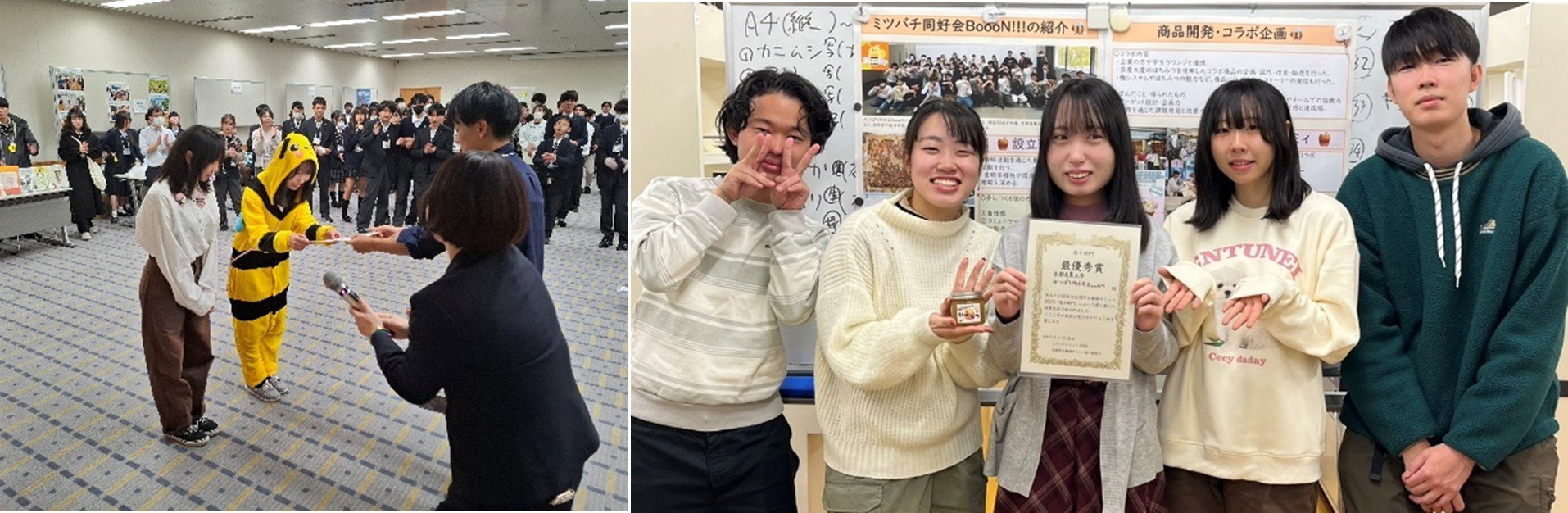 今回は、各校の代表が登壇して活動内容を紹介する口頭発表、リモートで活動を紹介するショート動画、交流会会場の展示ブースでは、ポスター・展示発表やはちみつを品評会が開催されました。本学のみつばち同好会BoooN!!!は、展示部門で最優秀賞を受賞しました。参加した4年次の吉田新さんは「学生養蜂サミットへの参加は今回が初めてで、最初は発表への不安もありましたが、全国の学生たちが温かく迎えてくれ、すぐに緊張がほぐれました。他校の活動はどれも新鮮で、自分たちにはない視点や工夫に驚かされました。発表を通じて、自分の言葉で活動を説明する大切さを実感し、大きな自信にもつながりました。ミツバチをきっかけに広がるつながりの力を強く感じ、これからの活動への意欲がさらに高まりました。」と感想を述べました。また、本学から実行員として参加した生命科学部高橋純一准教授は「全国から集まる多様な学校の取り組みを支え、つなぐ役目を担うなかで、学校養蜂が研究だけでなく、教育現場でも定着しつつあることを強く感じています。学生たちが養蜂を通じて学校、地域、社会とつながり、年々成長していく姿を見ることは、教員である私たちにとっても大きな励みであり、この活動を続けてきて本当に良かったと感じます。」とコメントしました。