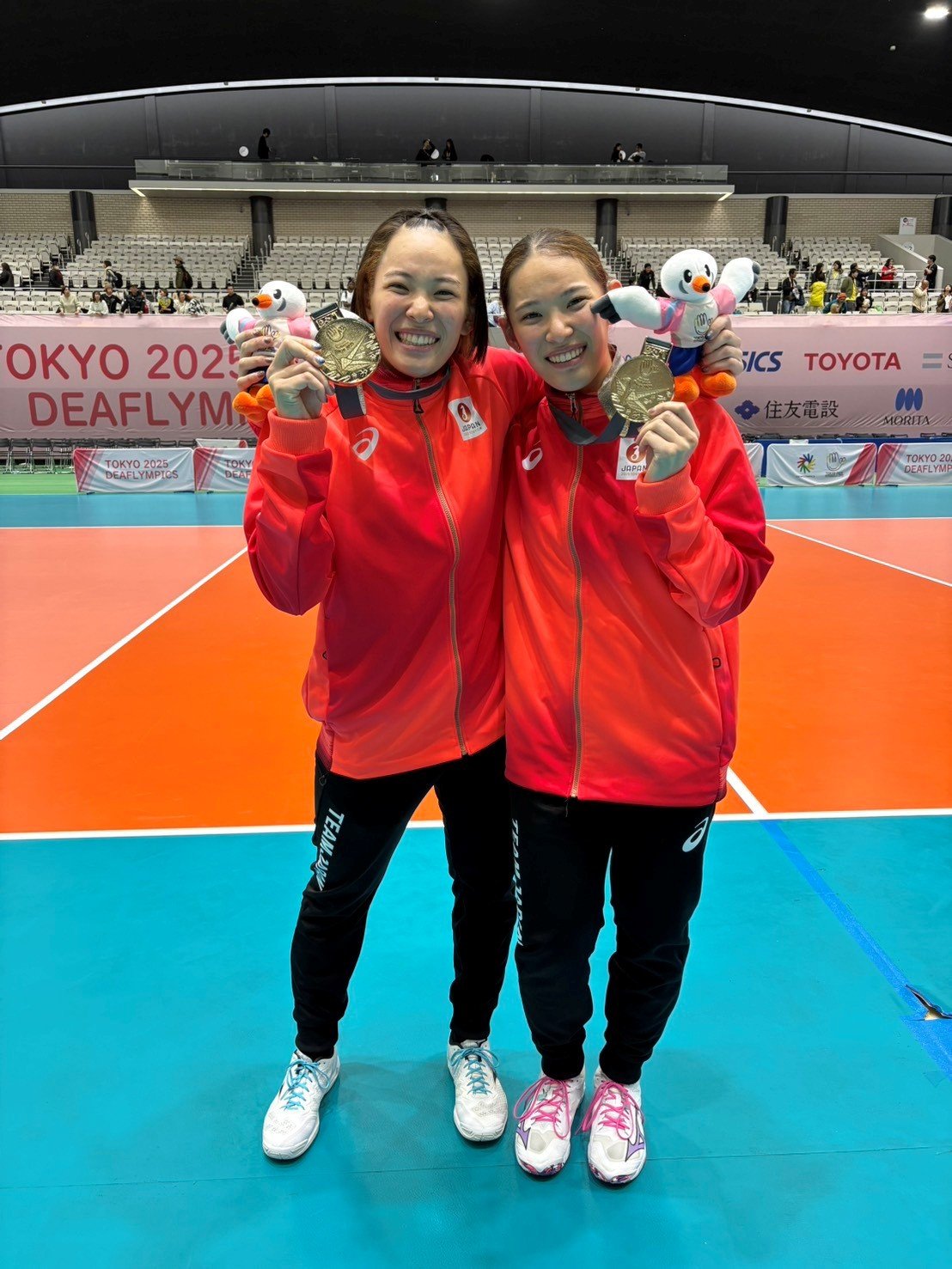 デフバレーボール女子日本代表として本学卒業生 梅本 綾也華(うめもと・あやか)さん、梅本 沙也華(うめもと・さやか)さん姉妹が東京2025デフリンピックに出場し、11月25日に開催された決勝戦でトルコを3-0で下し、2大会ぶりの金メダルに輝きました。