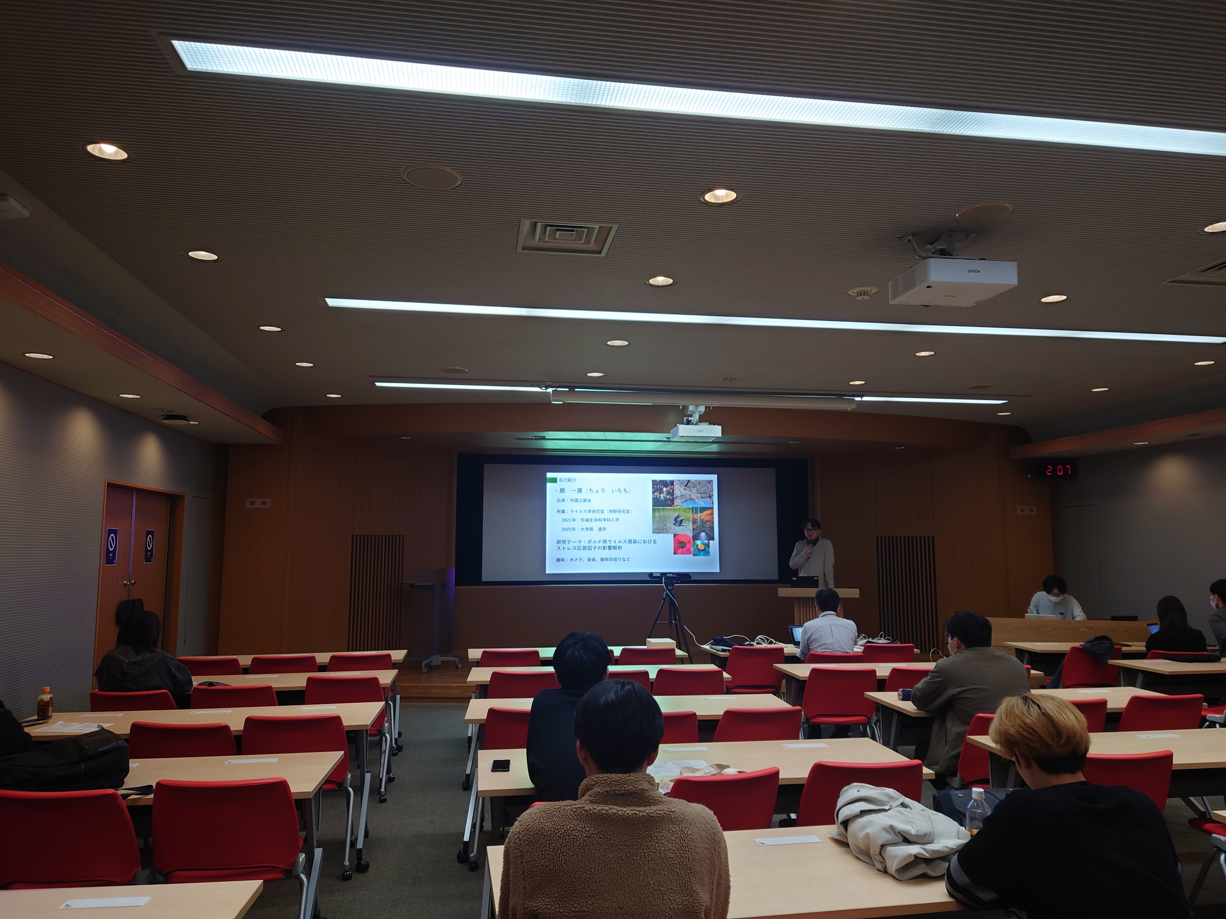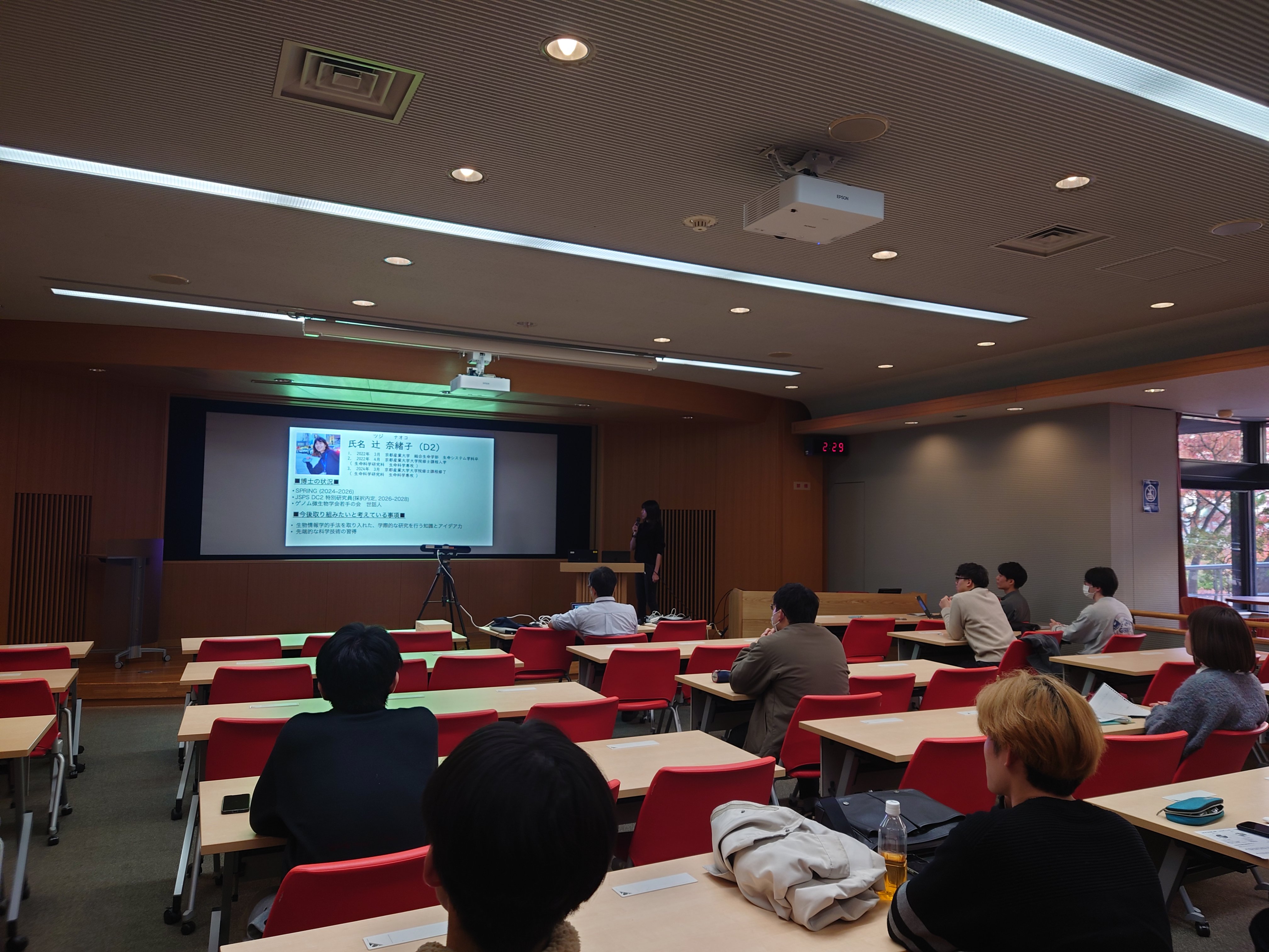 その後、「大学院生談話」では、⽣命科学研究科博⼠前期課程1年次のチョウ イチチさん、博士前期課程2年次の大倉 一馬さん、博士後期課程1年次の渡邊 弘樹さん、博士後期課程2年次の辻 奈緒子さんより、⼤学院進学を決めた理由や、院進学に向けて取り組んできたこと、⼤学院での目標や抱負、⼤学院で取り組んできたこと、⼤学院進学後の就職活動などの実体験について話をされました。